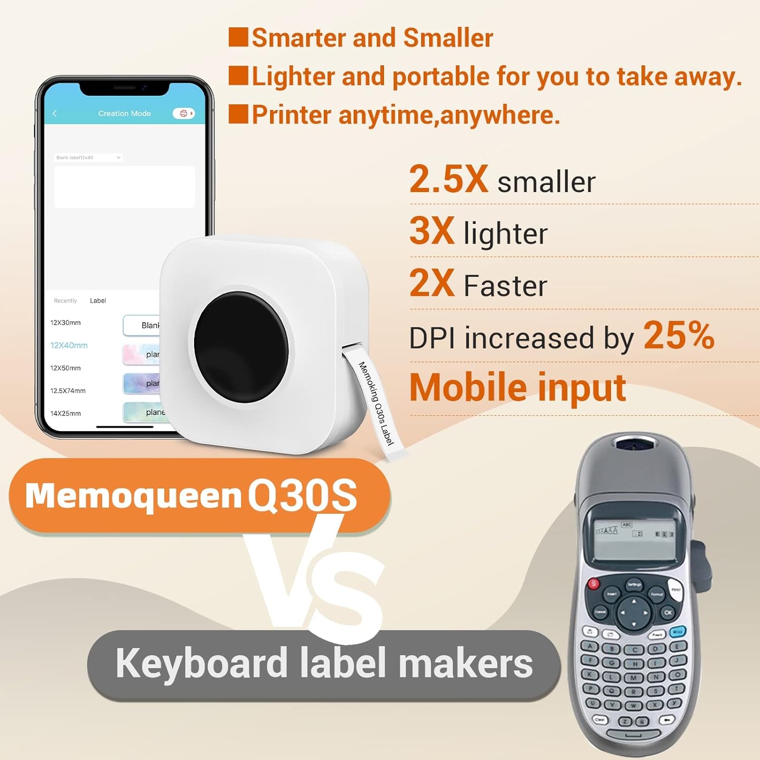 Handy label Maker – Memoqueen Q30S mini bluetooth label maker machine with tape is only 3.2*3.2*1.3Inch, 160g weight. Which is smaller than a palm and can be easily put in a handbag to take along and use it anywhere.