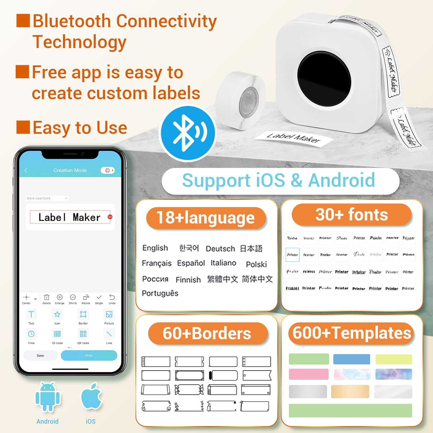 To be a Designer – The print master application has built-in creative patterns, Supports multiple line text, adorable icons, borders, images (203 dpi), 1D Code, QR Code, line input, geometry frame, Excel input, scan code, form input, OCR and even uses voice to input printing words.There are more than 50 templates and more than 500 icons, which can fully satisfy your design hobby.