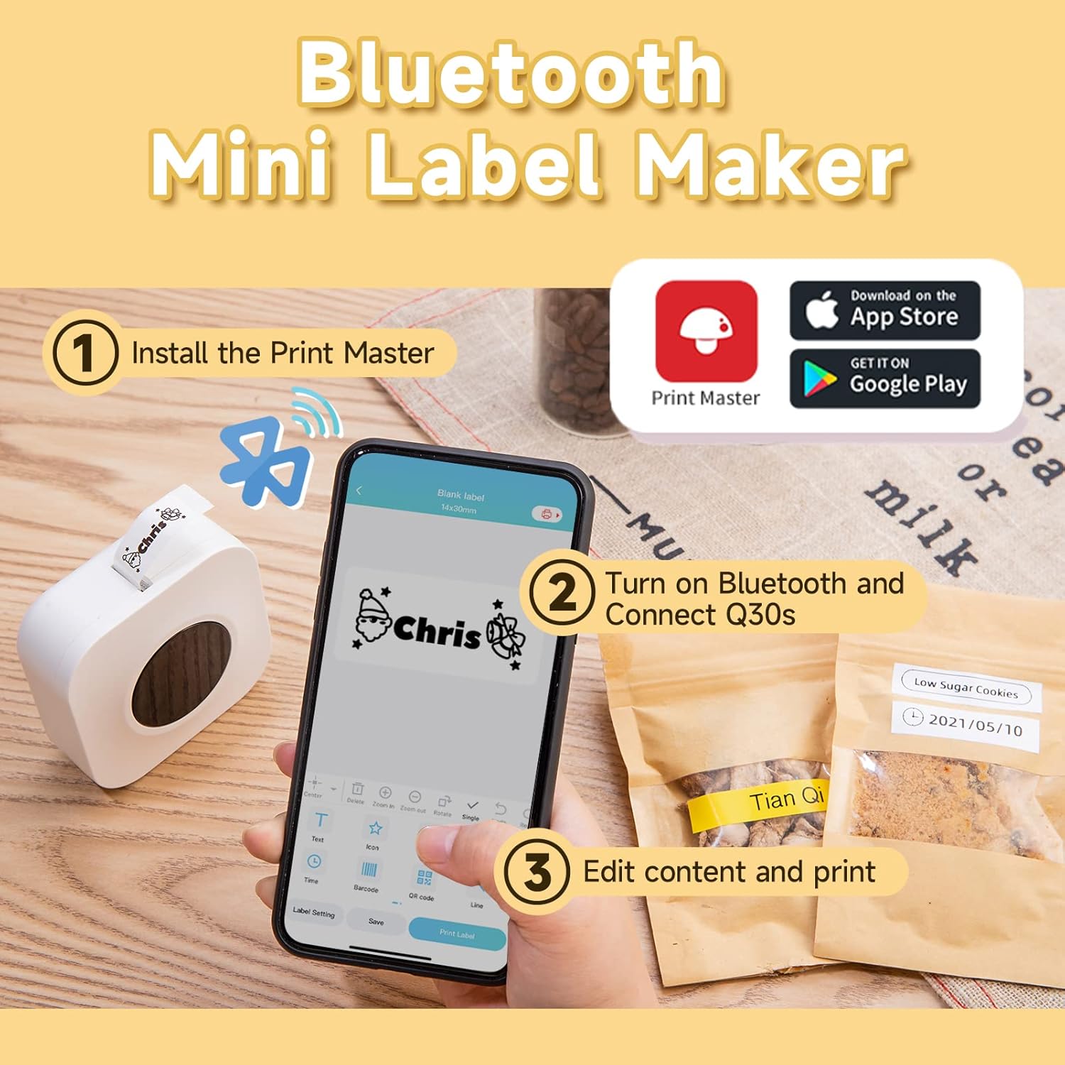 User Friendly Printer – Download the [ Print Master ] app, and open Bluetooth to connect Q30S small label Makers. No need any registration details. You just need to type your label in the APP and it will print out in the few seconds.