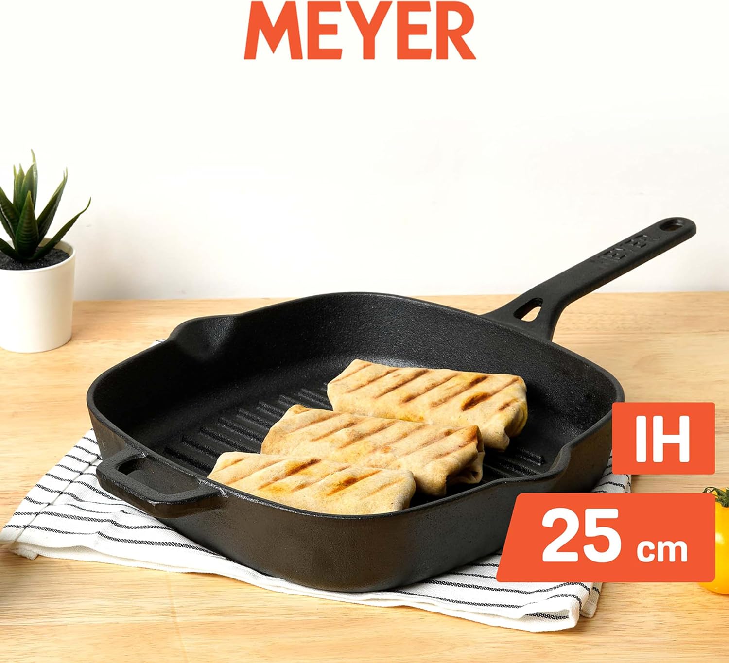 Meyer Cast Iron Grill Pan | 25CM Square Skillet for Indoor or Outdoor Cooking Pre-Seasoned Griller with Non-Stick Surface, Model-MY48492