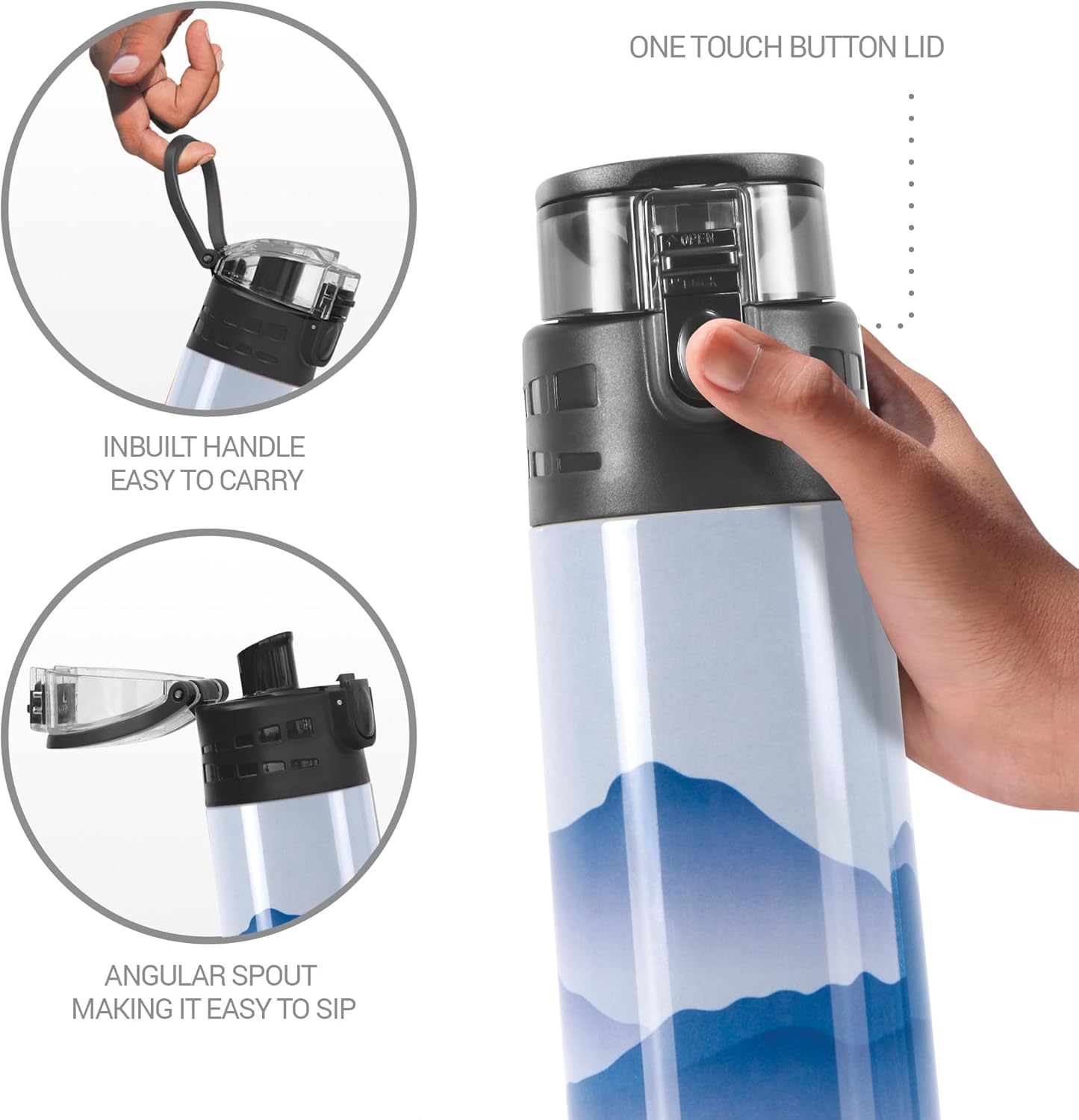 This bottle comes with a uniquely designed lid which offers the security of a locking system at the top. The clear lid guarded by a lock on the outside keeps the contents of the bottle from spilling out, even during a spirited hike up the trails.