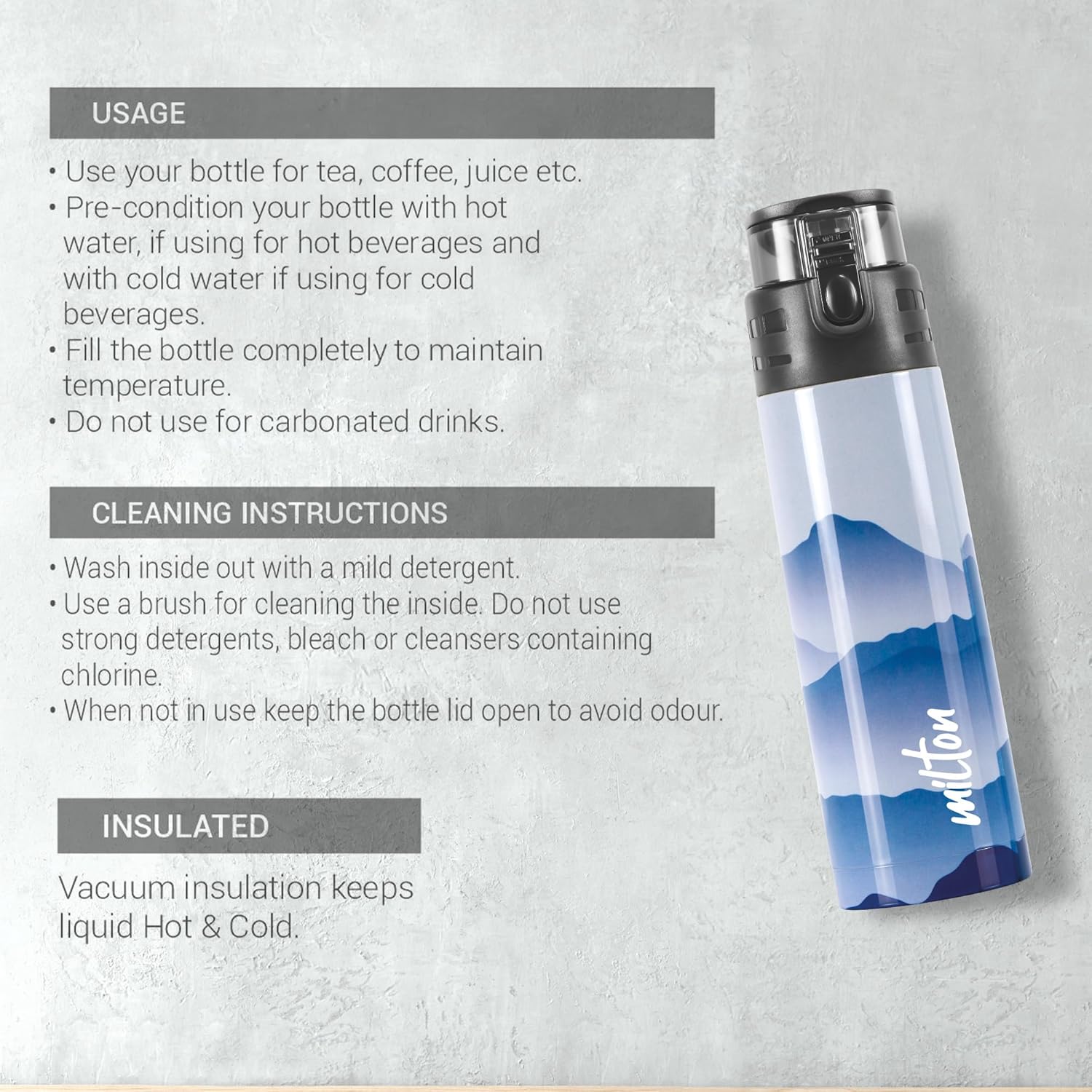 This portable bottle from Milton flaunts a beautifully slender construction which looks sleek, elegant and attractive. The smooth steel body is a delight to hold in your hands.