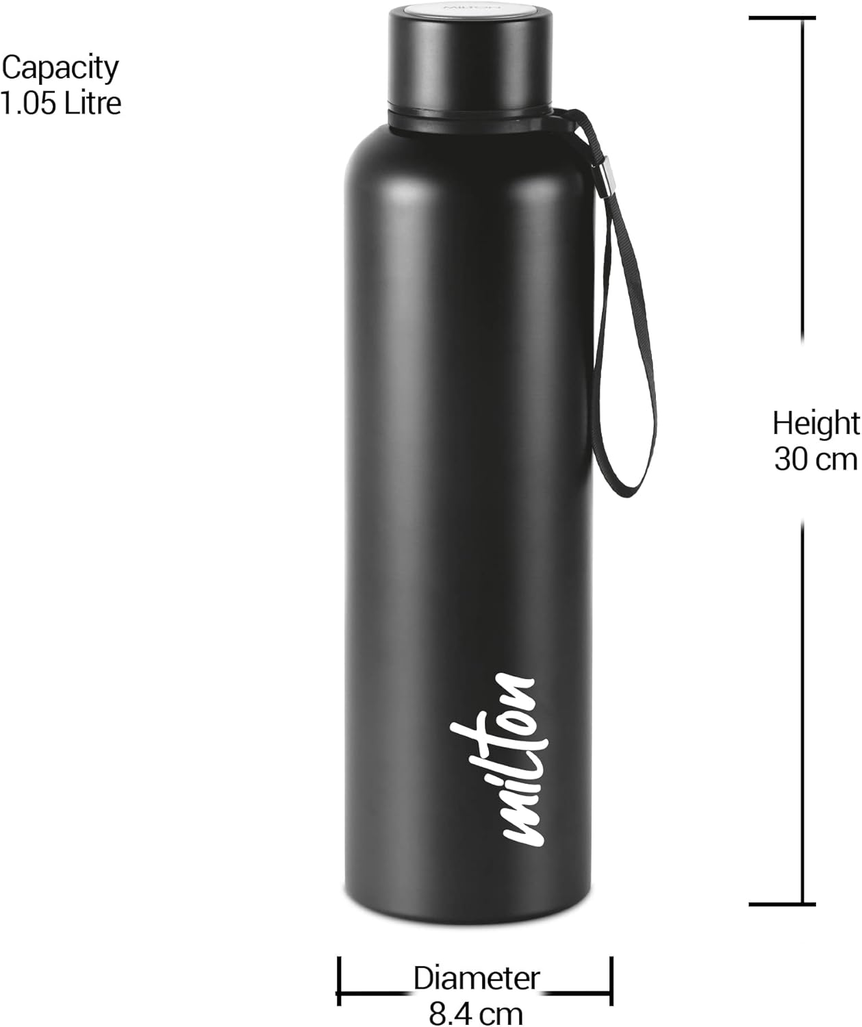 Milton Aura 1000 Thermosteel Bottle, 1.05 Litre, Black | 24 Hours Hot and Cold | Easy to Carry | Rust & Leak Proof | Tea | Coffee | Office| Gym | Home | Kitchen | Hiking | Trekking | Travel Bottle