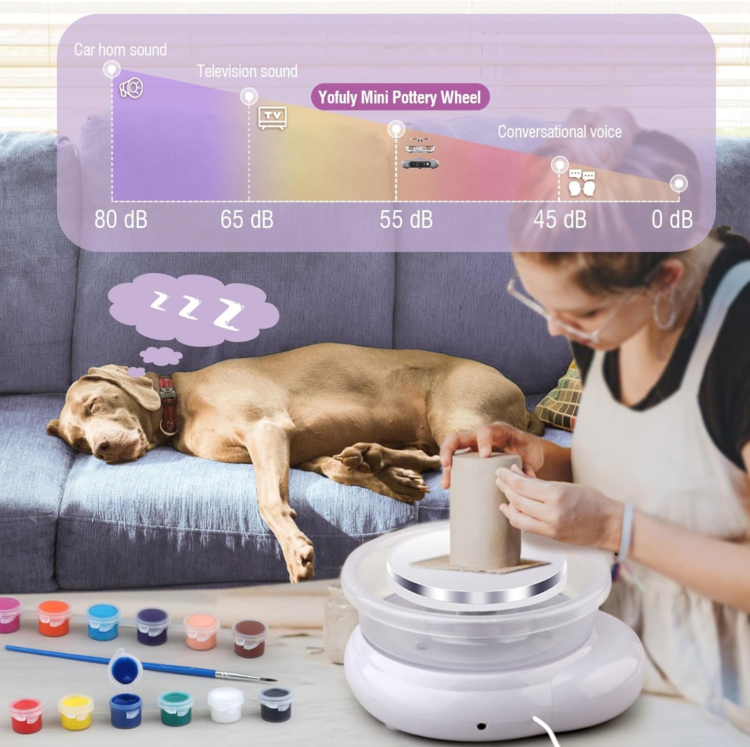 🌺【All-inclusive tools】 Our miniature pottery wheel include an 8-piece pottery knife set, a 6-color paint set, brushes, a paint basin, and an 8-piece pottery embossing set to fulfill all your pottery DIY needs.