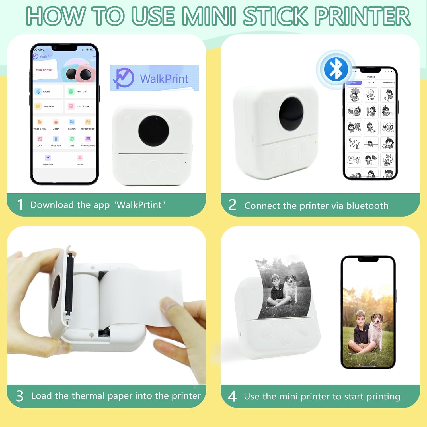 【Bluetooth One-Click Printing】When using the mini sticker printer, download the “WalkPrtint” APP application Bluetooth connection, after successful connection, put the thermal paper into the mini thermal printer correctly, select the template you want to edit and print!