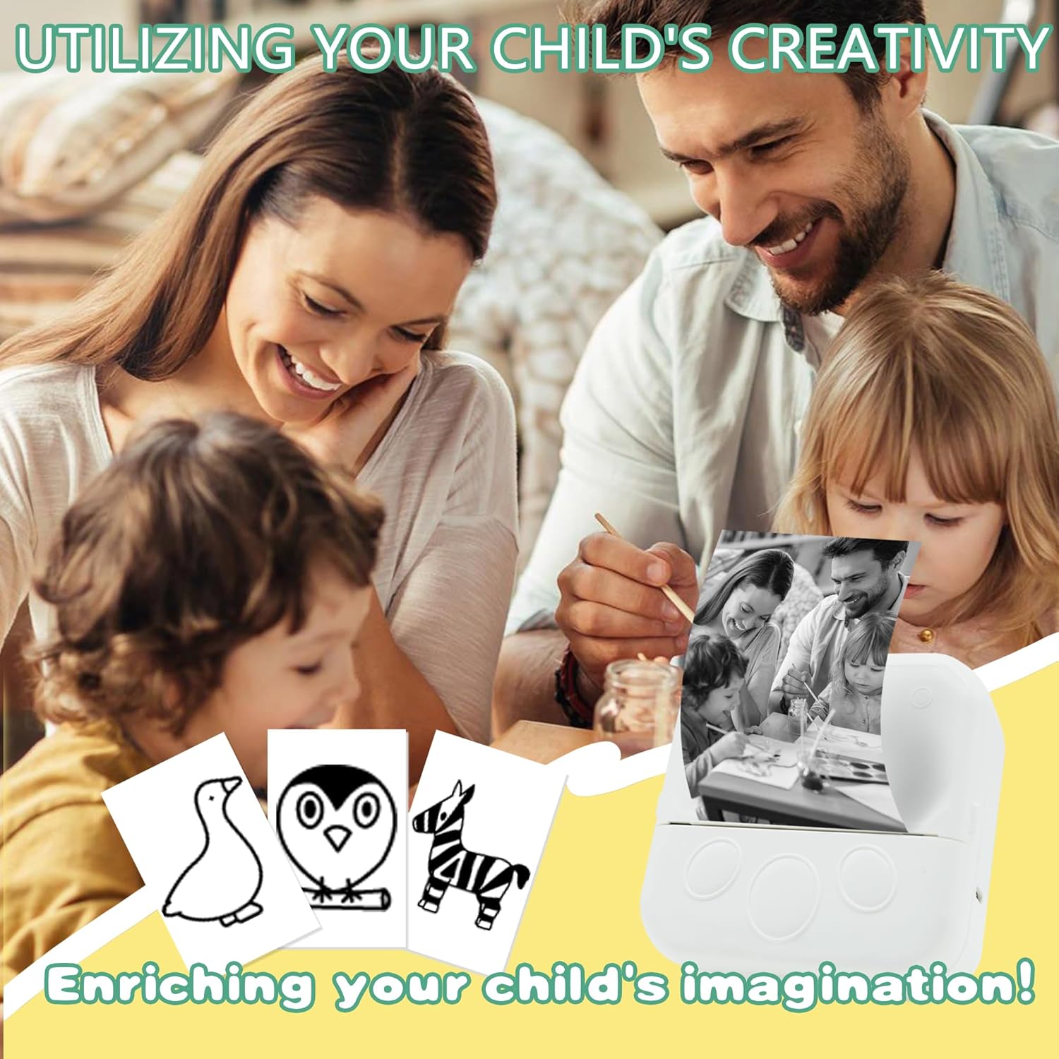 【Enhance Your Child’S Imagination】Mini printer sticker maker has a variety of labels and pictures in the app, your child can use their imagination to create a new piece of artwork together with their parents and print it to keep it as a record of their beautiful life.