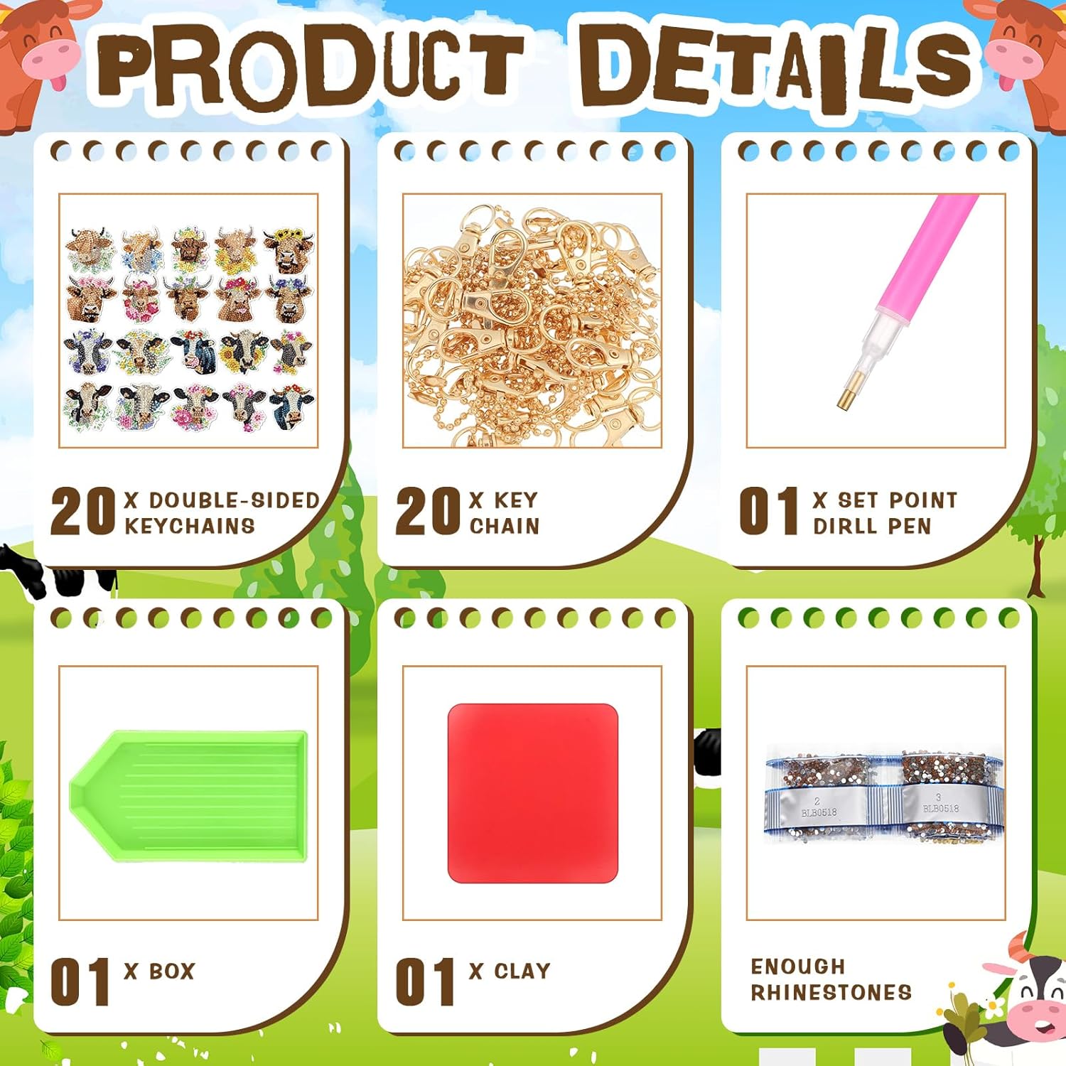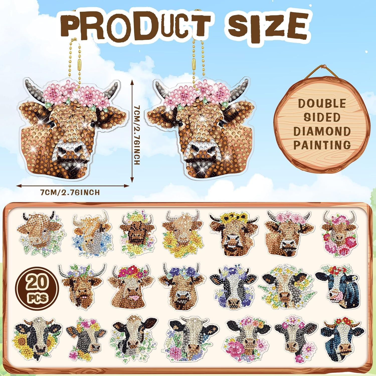 Misdary 20 Pcs Cow Diamond Art Keychains Spring Diamond Art Ornaments DIY Rhinestone Painting Kits Flower Diamond Art for Adults Kids Craft Home Decoration