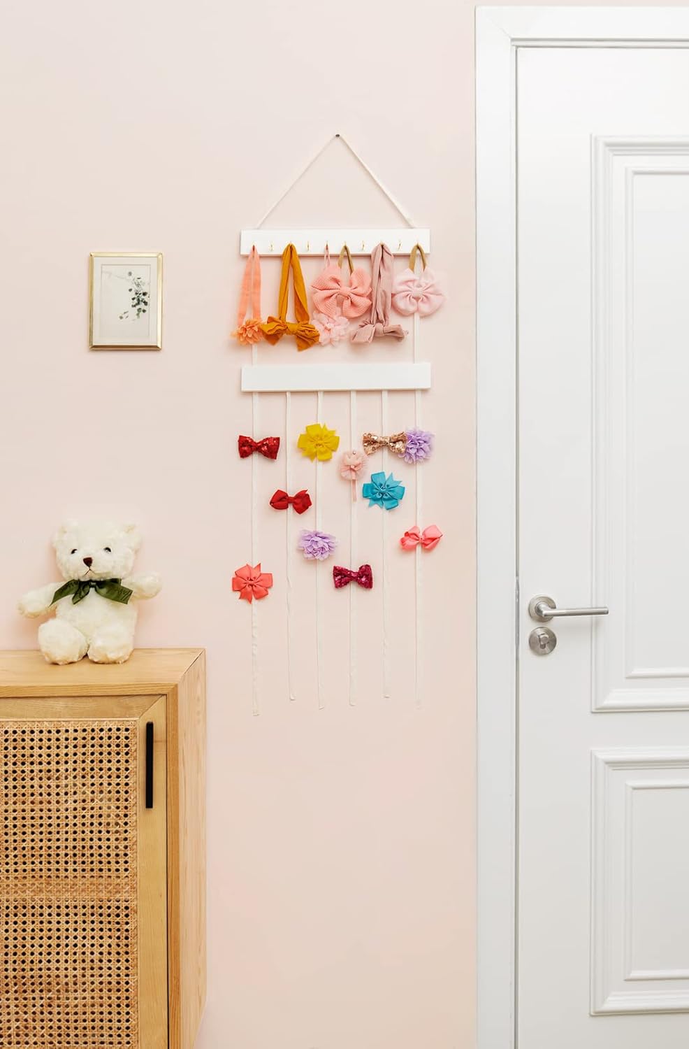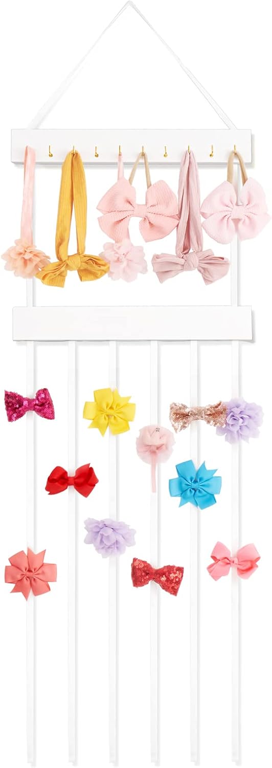 Large capability -meet all hair accessories storage needs: 2-tiers hanging bow and clip holder is suitable for a various of headwears. The upper wooden board has 10 metal hooks, which can perfectly store hair bows, headbands, scrunchies, ties, belt. White long ribbons is great for storing hair clips. Make kid’s room orderly and beautiful.