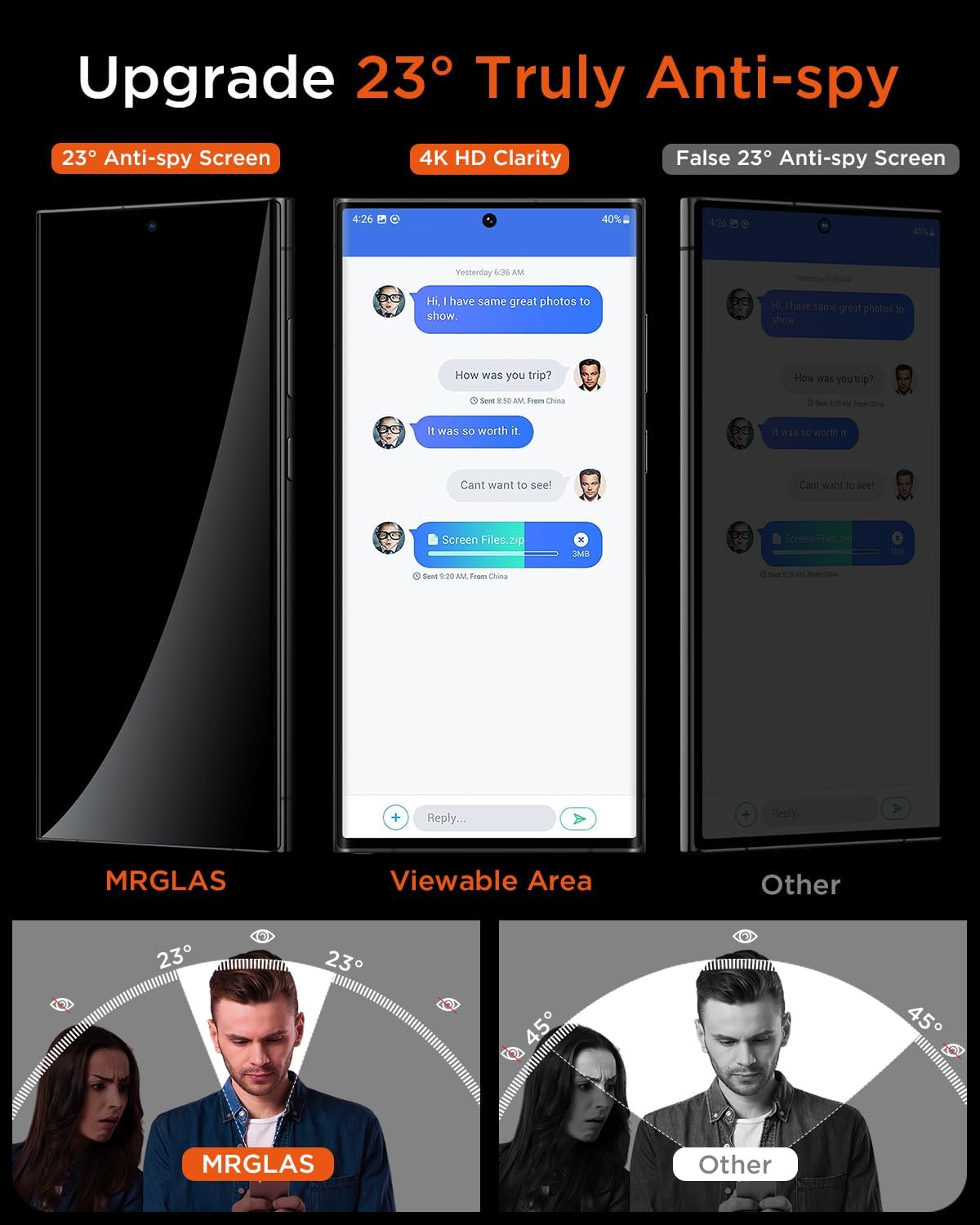 π[Excellent Privacy Protection] MRGLAS Samsung Galaxy S24 Ultra Privacy Screen Protector achieve 23Β° super powerful privacy function. When you’re in an elevator, subway, bank or other public place, block the view which trying to view your secrets from both sides. Your friends or coworkers sitting next to you won’t be able to see your information, providing the strongest protection for your privacy and sensitive information.