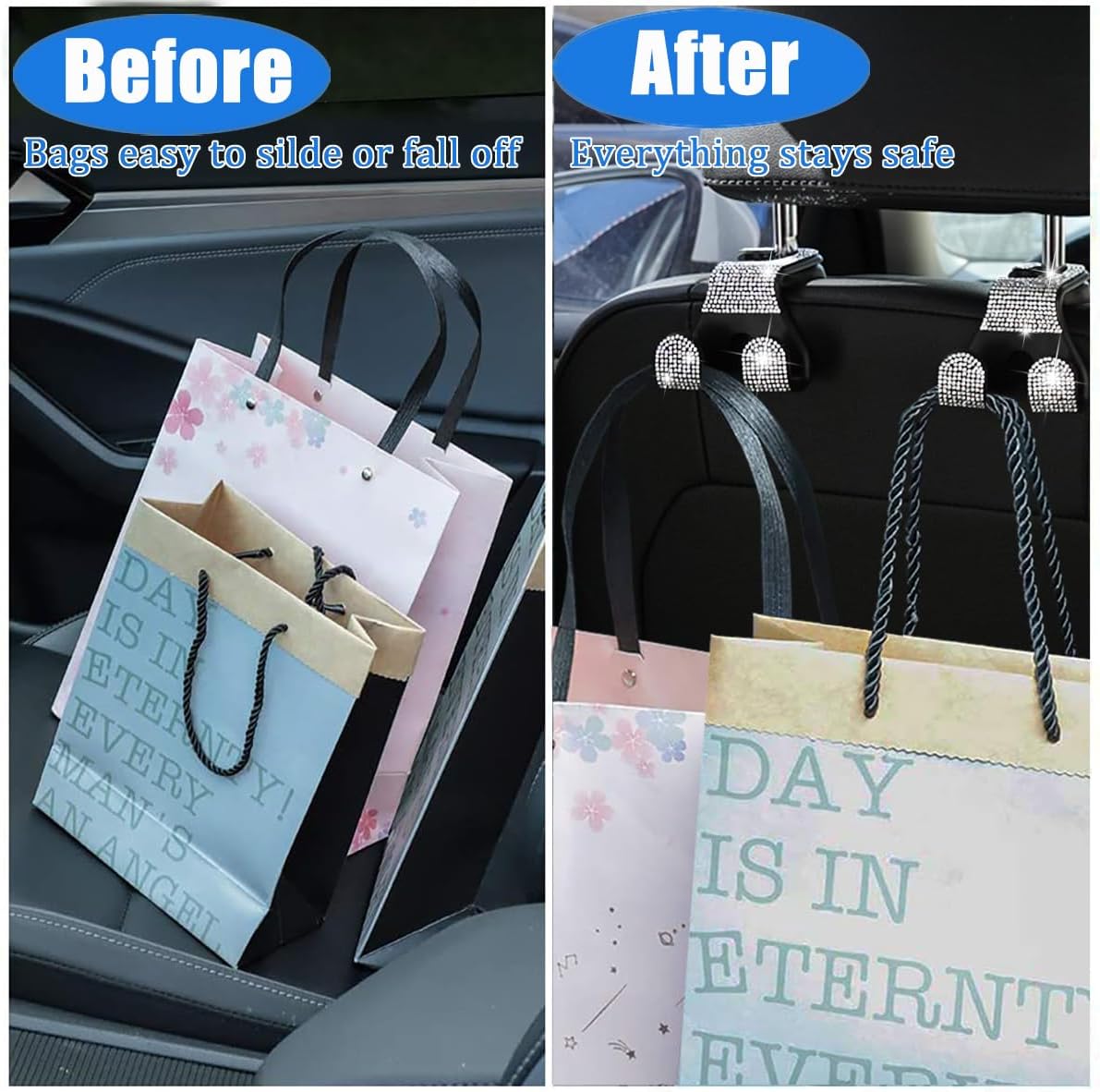 【NO MORE MESSY & CUTE BLING CAR INTERIOR】With this universal bling car purse holder hook you can prevent your handbags,grocery bag falling from the seat while driving, SayGoodbye to the Messy. These car back seat hook are great for hanging groceries like handbags, purses, shopping bags, clothes etc.