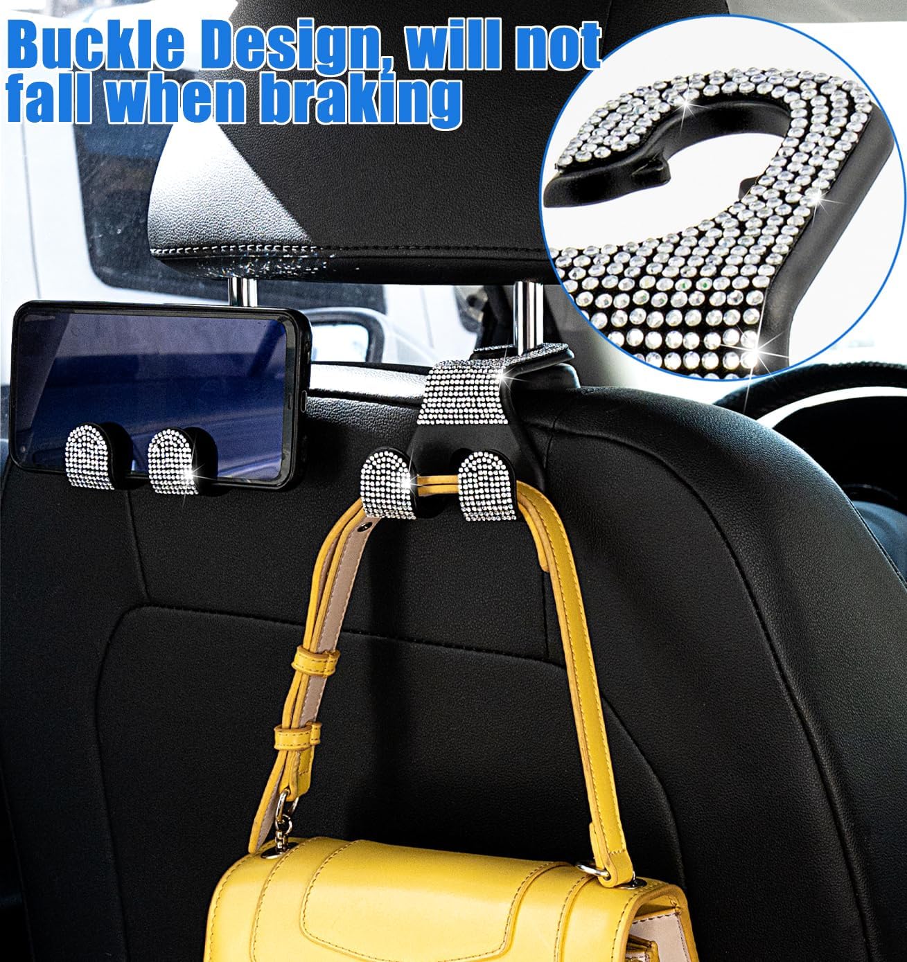 【Won’t FALL OFF & EASY TO INSTALL】The bling car seat hanger for purses and bags with BUCKLE-DESIGN, easy to install but will not fall off when suddenly braking or not hanging anything. Just hang the purse holder car hook bling for seat on the headrest rod, no need to remove the headrest! This purse hook for car are Perfect gift for women,girls who have a car.
