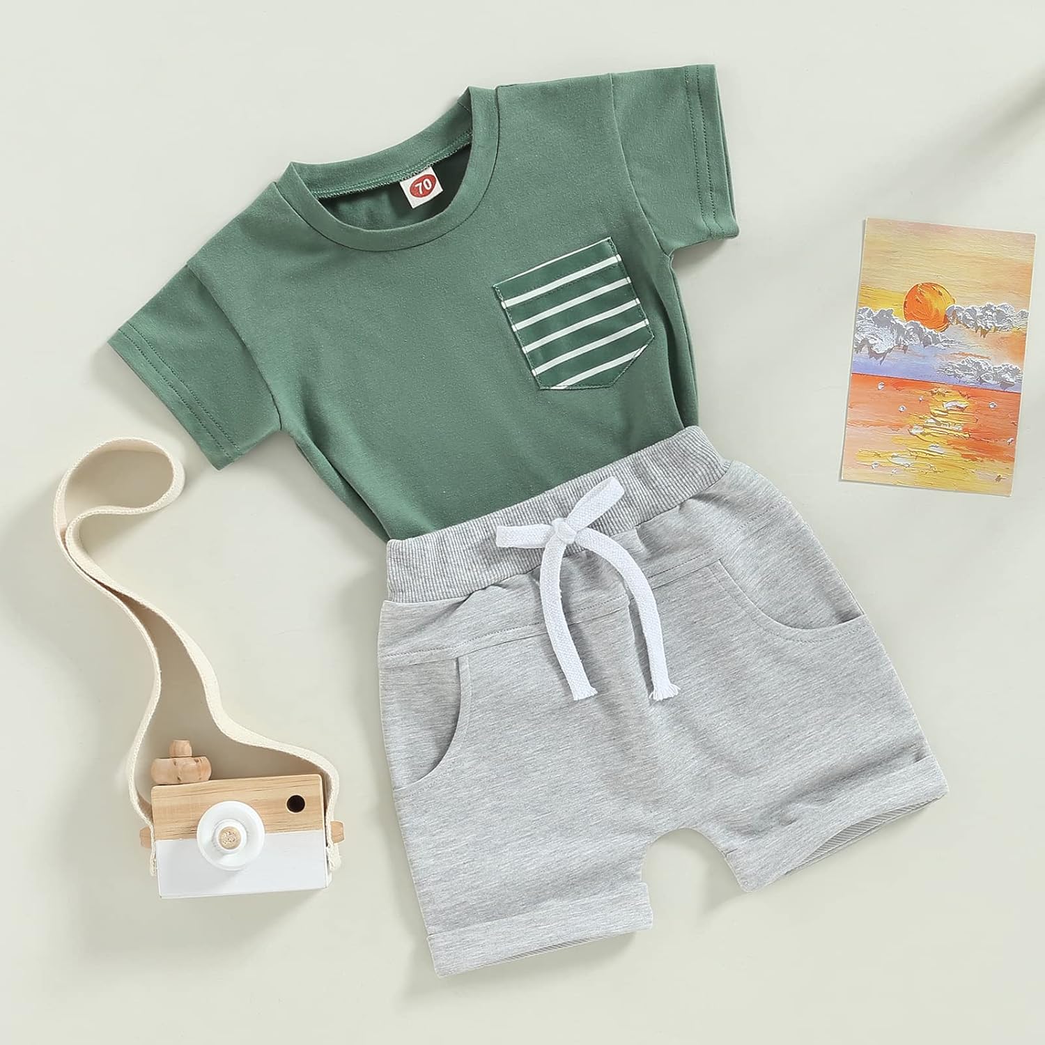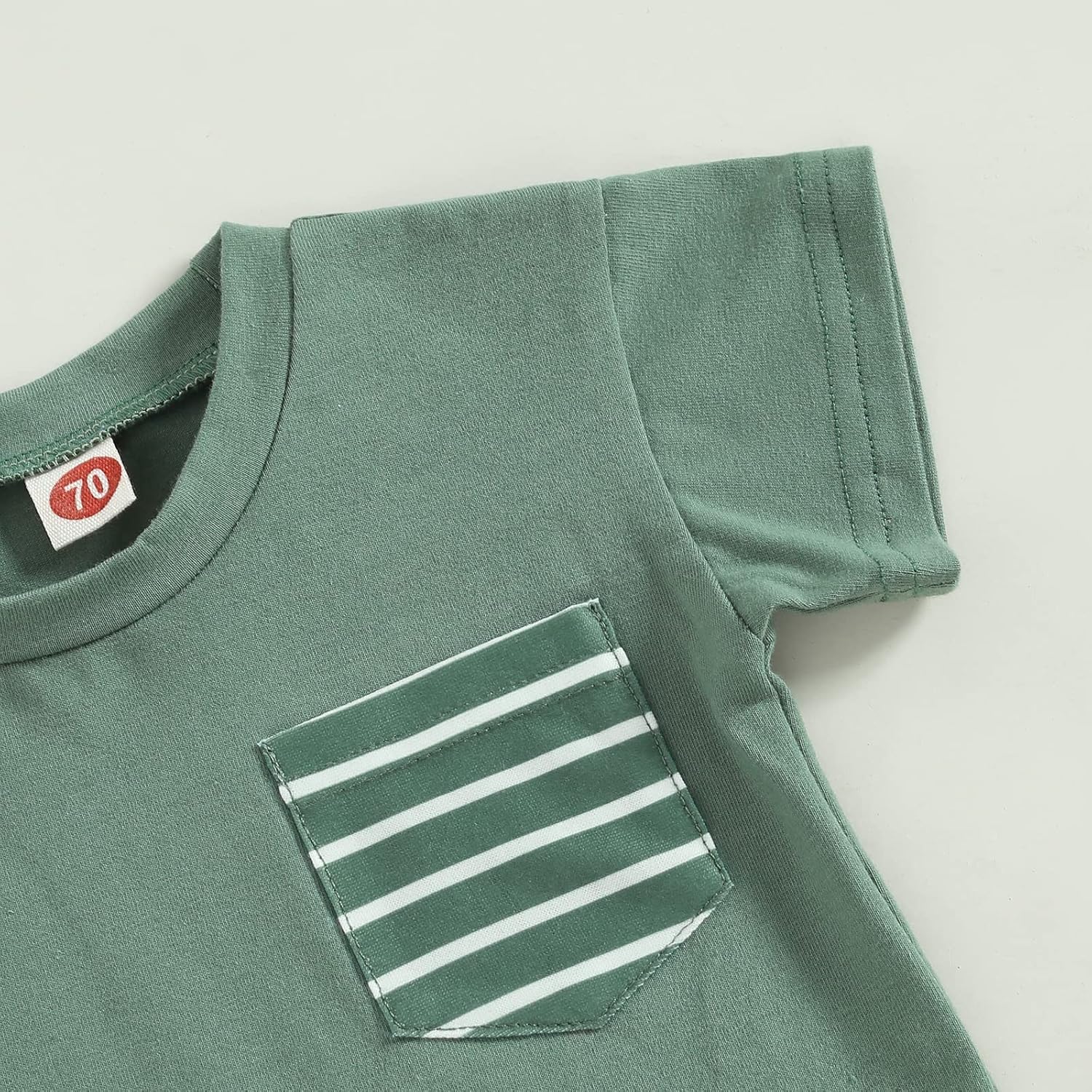Feature: Relax Crew Neck, One Pocket Front, Striped Pattern, Comfy Short Sleeve T Shirts Tee Tops, Elastic Waist with Drawstring Shorts, Side Pockets, Comfy and Cute Newborn Baby Boys Summer Outfits Clothes, Infant and Toddler Boy Comfy Cotton Shorts Sets