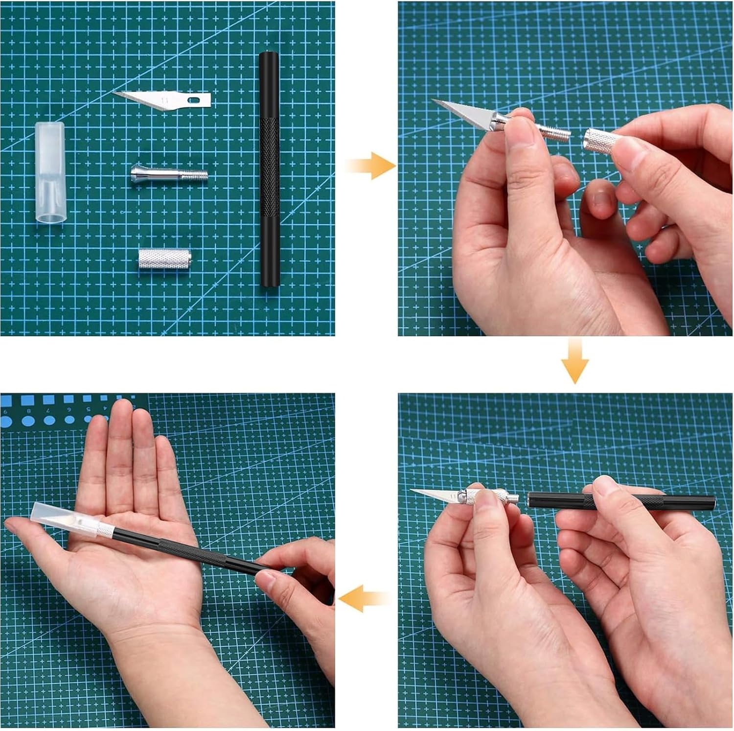 How to use: first, unscrews the tip of your knife to unlock the blade and take out the dull razor, then swap out to lock the replacement blade in place and tighten it back up