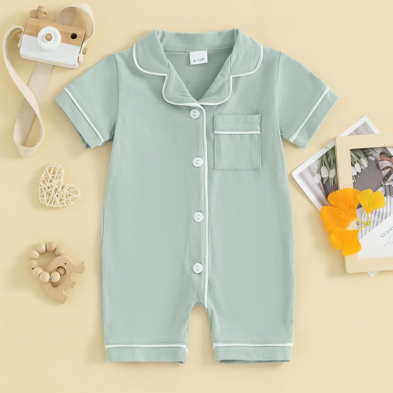 Infant Baby Boy Girl Pajamas Rompers Button Down Short Sleeve One Piece Jumpsuit Pjs Pocket Infant Summer Sleepwears