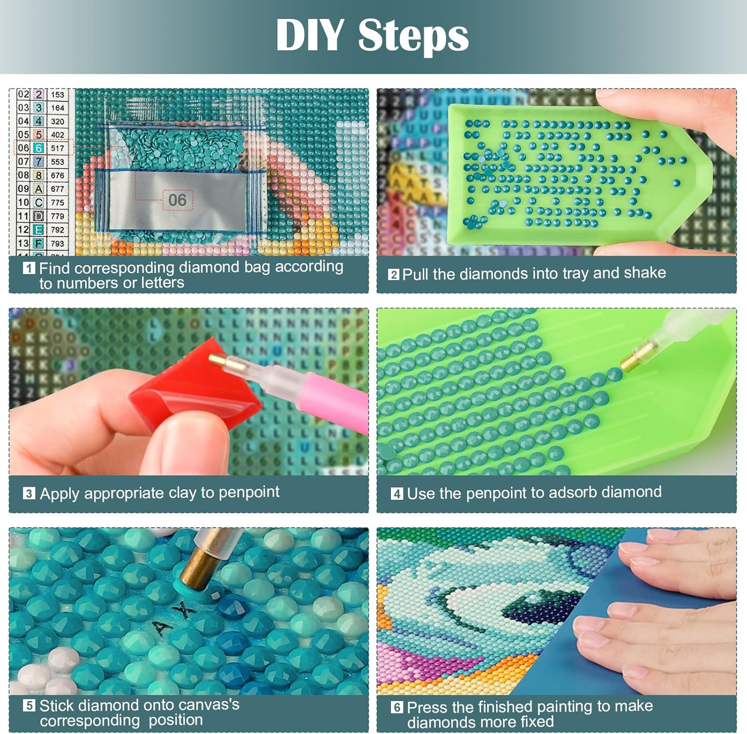 Contain All Tools – Diamond gem art painting kits contain all tools: 1 high definition canvas, 1 diamond tray, 1 big wax, 2 diamond pens, 1 replaceable correction pen, 5 ziplock bags and enought round diamonds.