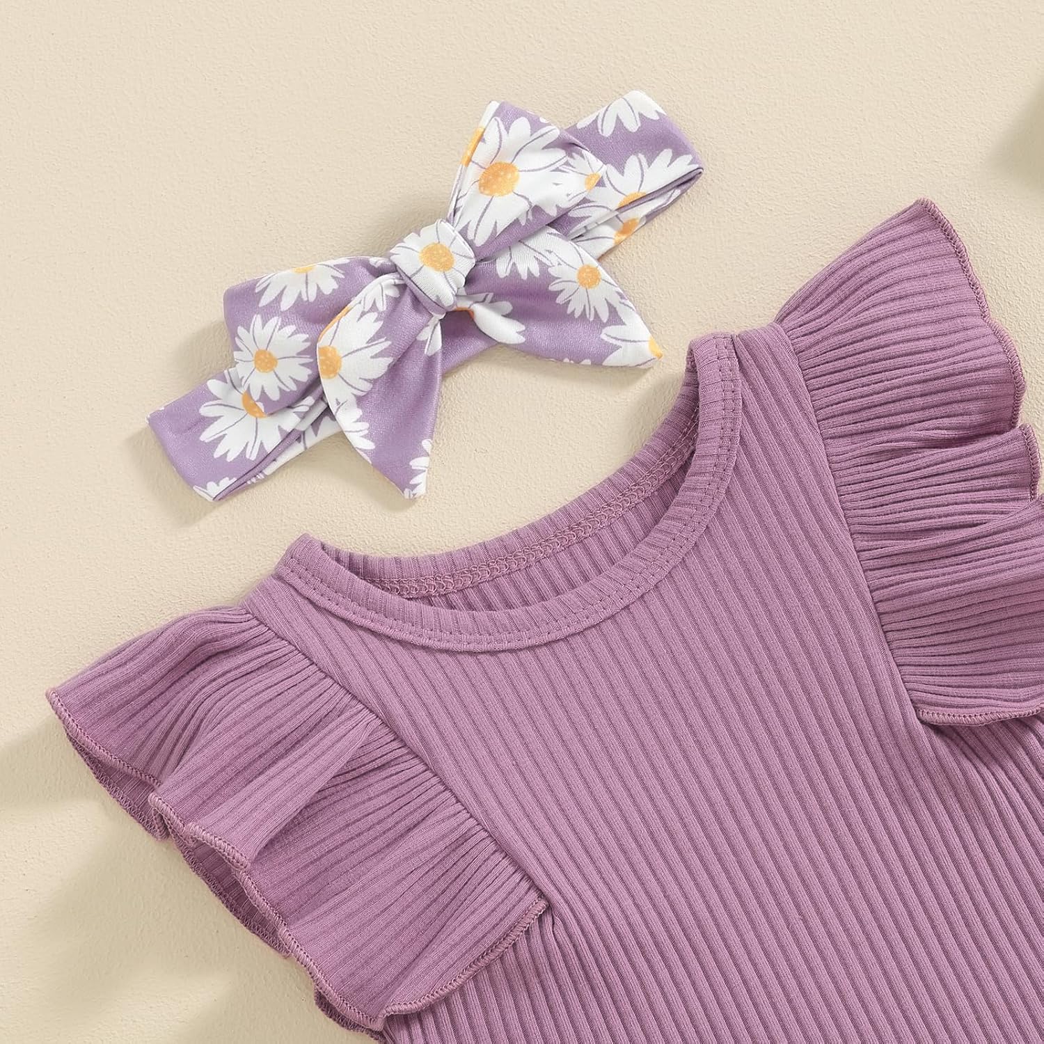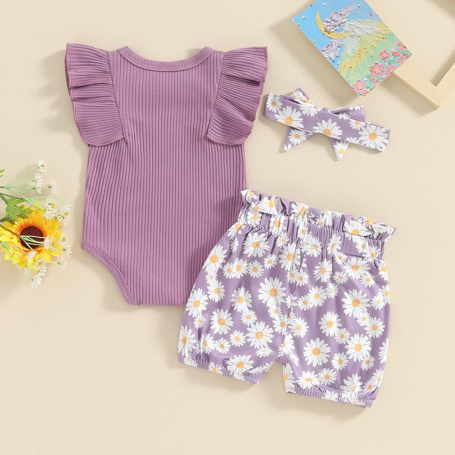 Newborn Infant Baby Girl Summer Clothes Rib Frill Short Sleeve Romper Elastic Waist Shorts Headband 3Pcs Outfits Set