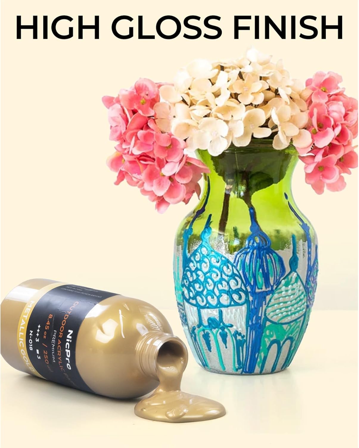 Rich Outdoor Acrylic Paint Set :This Nicpro outdoor paint set contains 20 vibrant color in large volume-250ml/8.45 fl oz. each: White, Mars Black, Red, Lemon ,Ochre, Orange, Red, Pink, Cobalt Blue,Ultramarine Blue, Sky Blue, Phthalo Green, Sap Green, Spring Green, Violet, Burt Sienna, Burnt Umber, Gray, Metallic Gold, Metallic Silver.