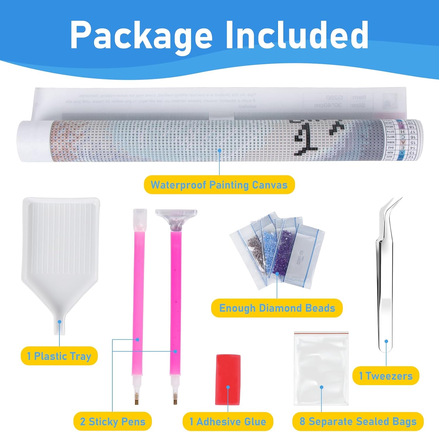 1 x HD painting canvas 2 x diamond pens 1 x glue (2*4cm) 1 x diamond tray 8 x small plastic bag 1 x tweezer Enough round diamonds
