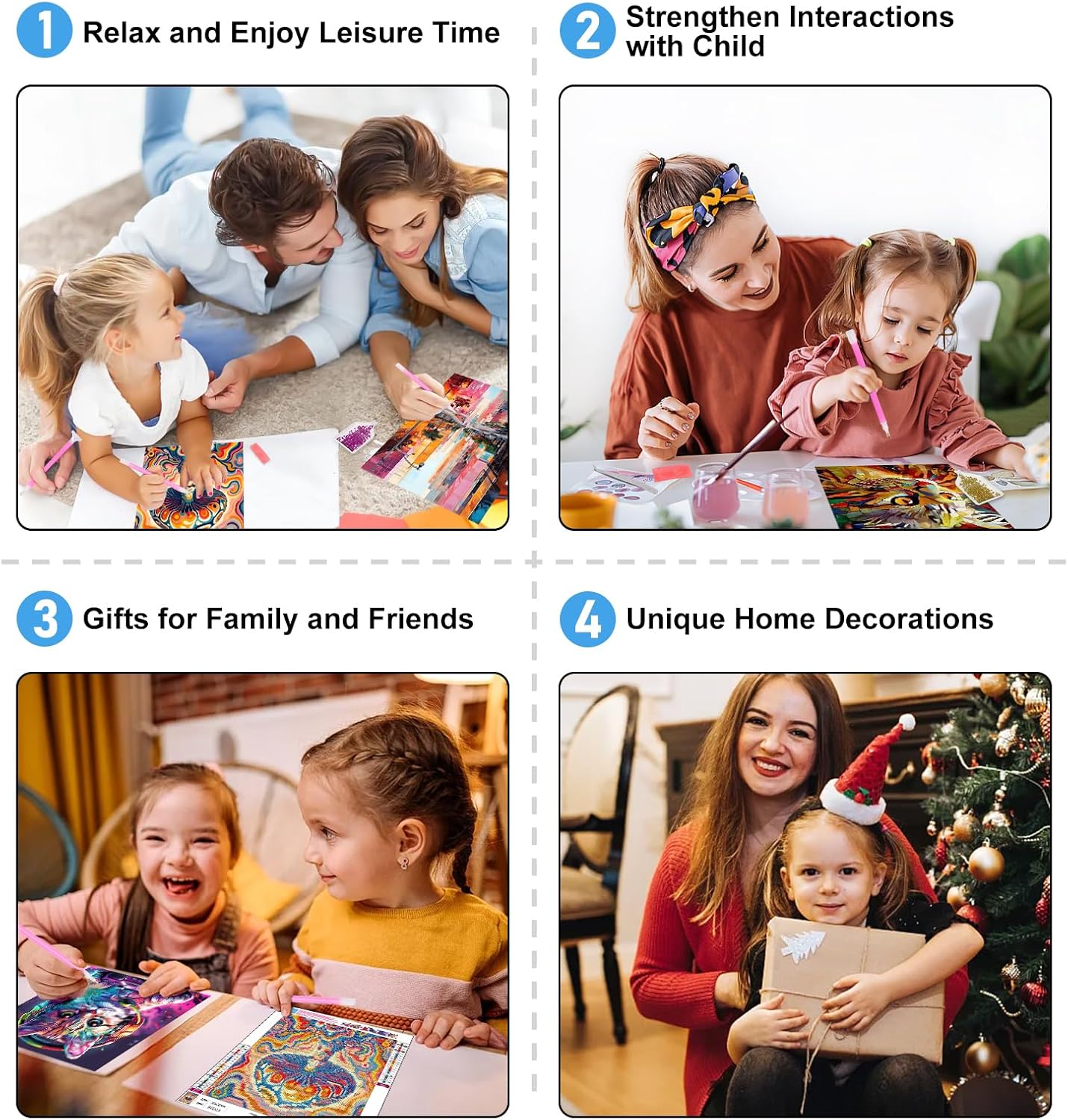 About Diamond Art: Our diamond artwork is a great choice not only for family time but also for gatherings with friends and craft lovers. It’s a nice way to reduce stress, regulate emotions, enhance perseverance, develop patience, and improve hands-on skills for adults. You can feel a sense of achievement when you finish a whole piece.