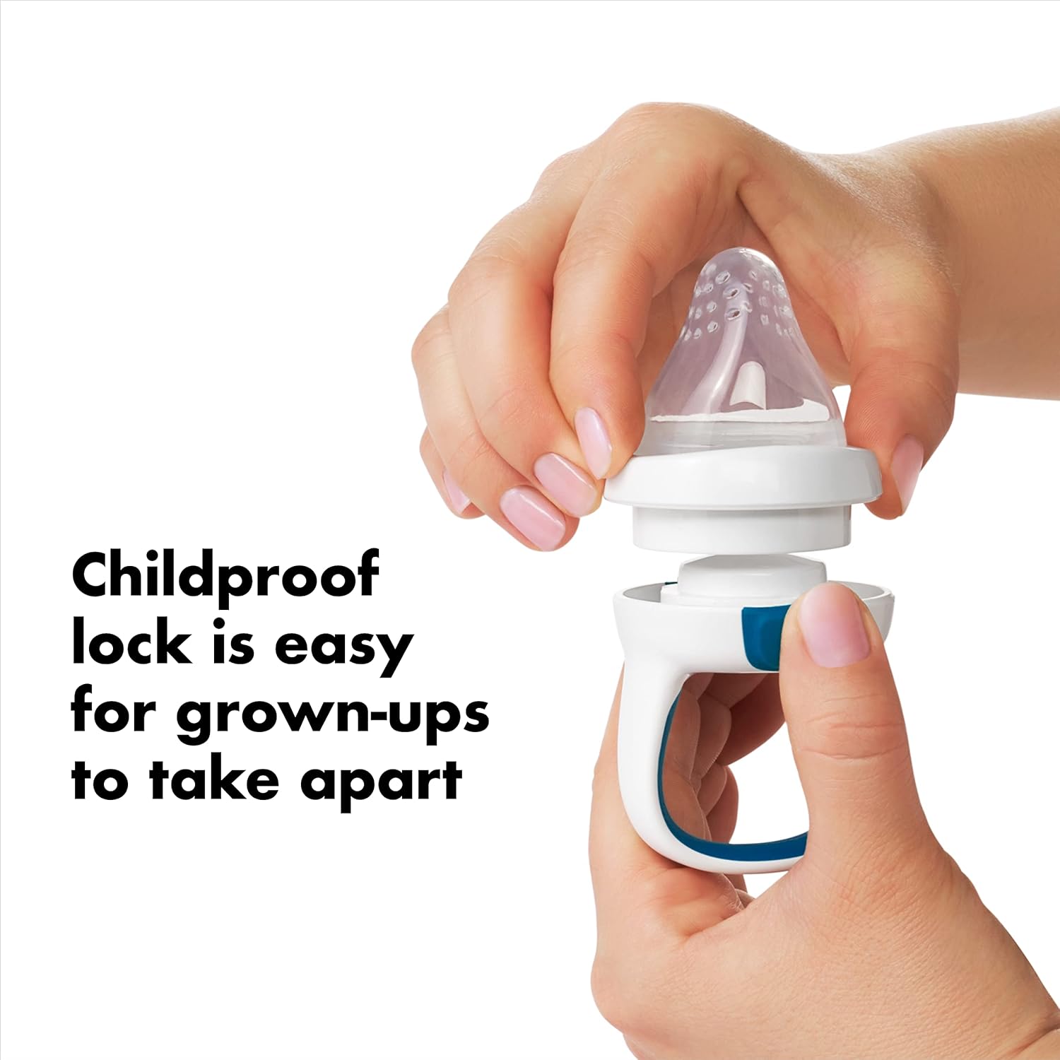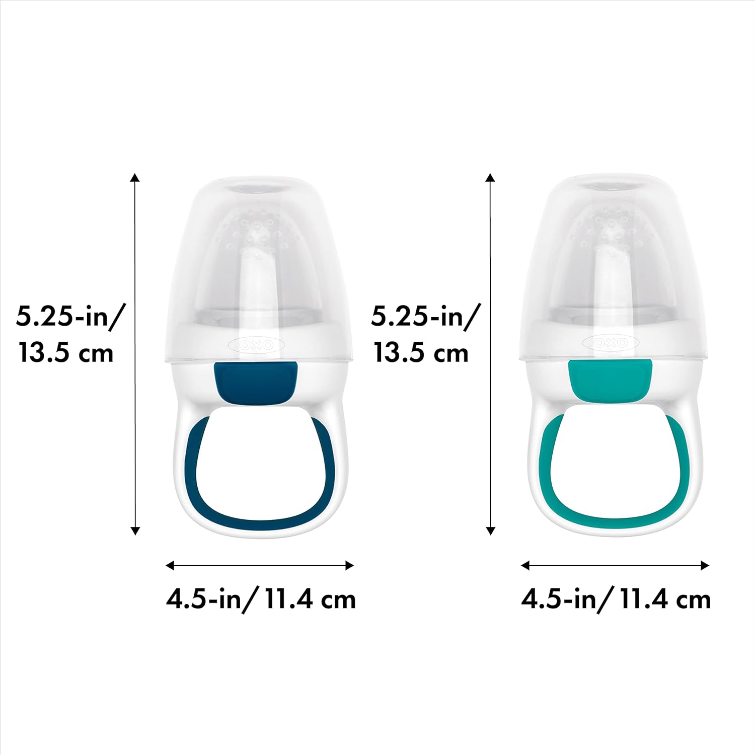 The OXO Tot Silicone Self-Feeder is a safe and soothing way for little ones to learn to snack on their own. Just place fresh or frozen fruit or veggies in the large-capacity pouch, twist the childproof lock and let the self-feeding begin. Carefully shaped non-slip handle is just right for little hands, the food-grade silicone is easy to clean (really!), and the lock is easy for grown-ups to take apart. The snap-on cover makes the Feeder great on the go. BPA free. Top-rack dishwasher safe. Set of two.
