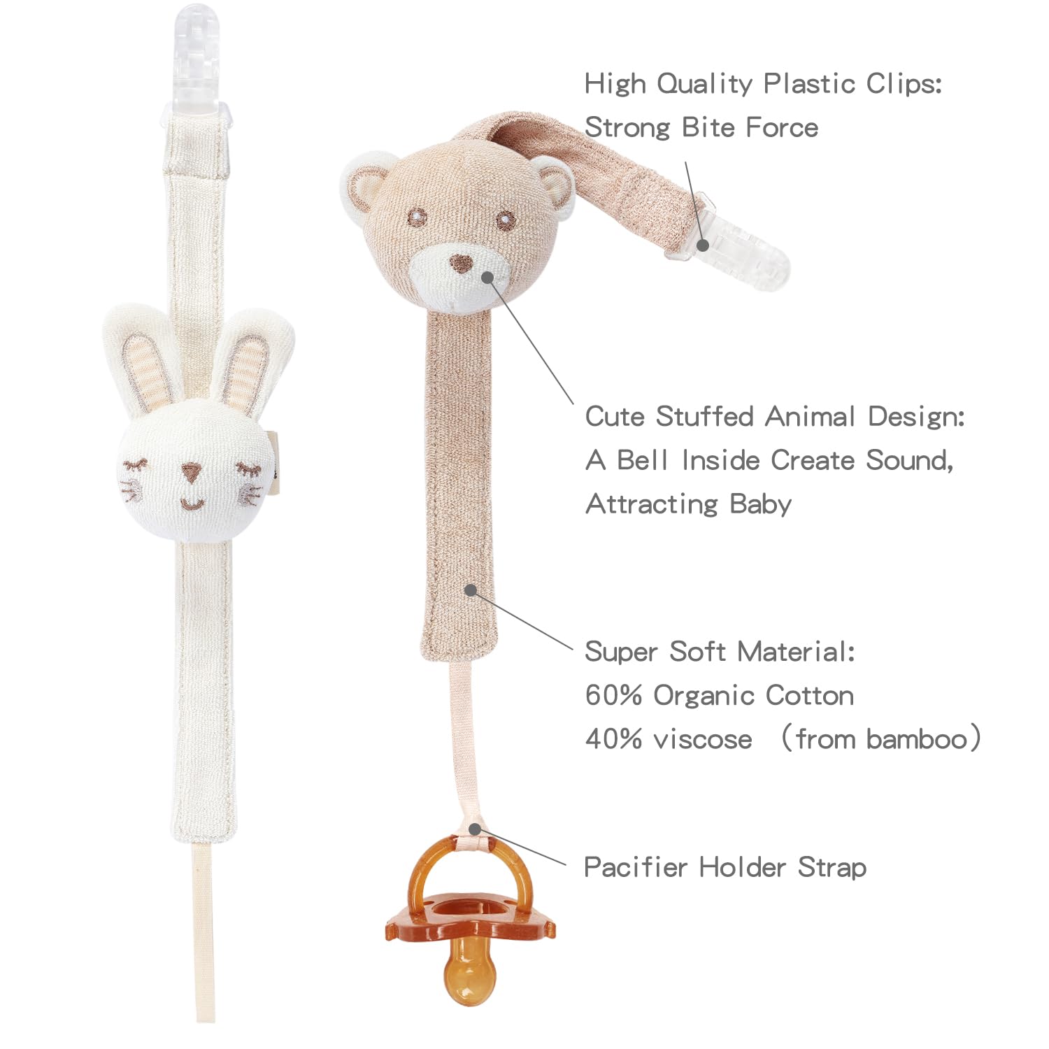 Pacifier Clip, 2 Pack Baby Pacifier Holder for Boys and Girls Fits Many Pacifiers & Baby Teething Toys, Ideal Baby Gift (Rabbit&Bear)