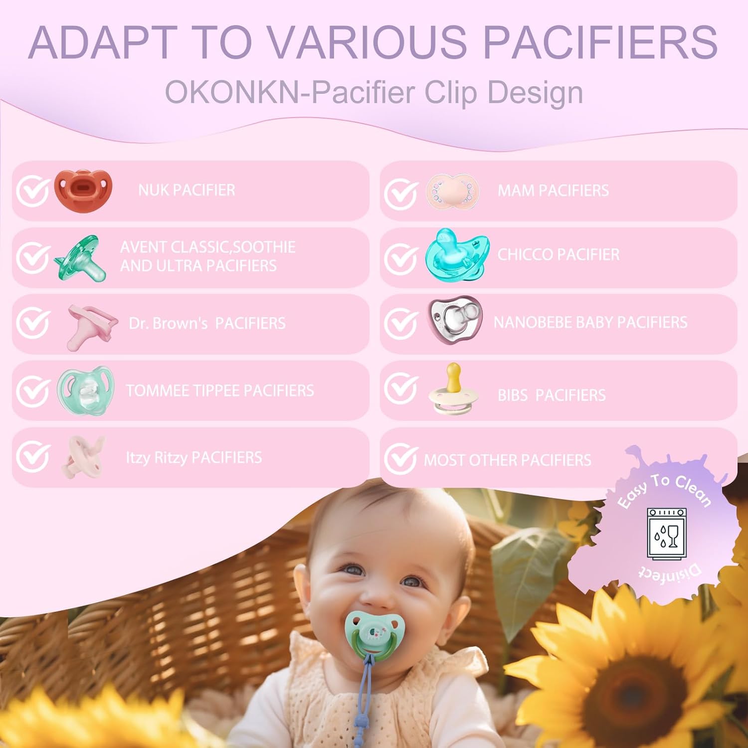 🍑𝟏𝟎𝟎% 𝐅𝐨𝐨𝐝-𝐆𝐫𝐚𝐝𝐞 𝐒𝐢𝐥𝐢𝐜𝐨𝐧𝐞: With a 10BL tensile strength, OKONKN pacifier holder are reusable and stretchable. Effortlessly clean and disinfect,eliminating concerns about dust and thread shedding seen in polyester clips. Reduces the risk of bacterial infection for babies, making maintenance hassle-free.