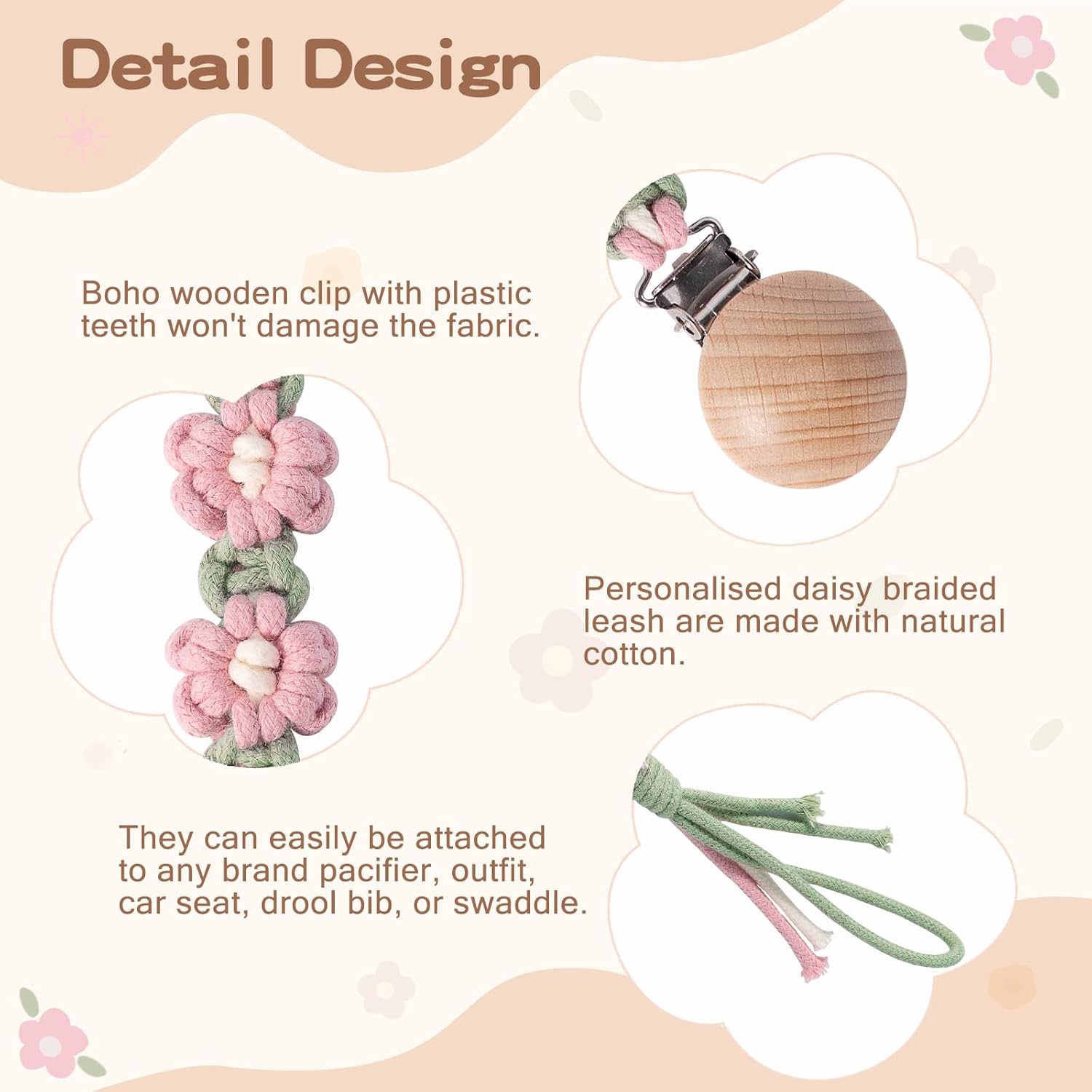 Pacifier Clip for Boys Girls Floral Daisy Macrame Paci Clip Pacifier Holder Leash Boho Wooden Clips Handmade Braided Cotton Unisex Baby Shower Birthday Gift