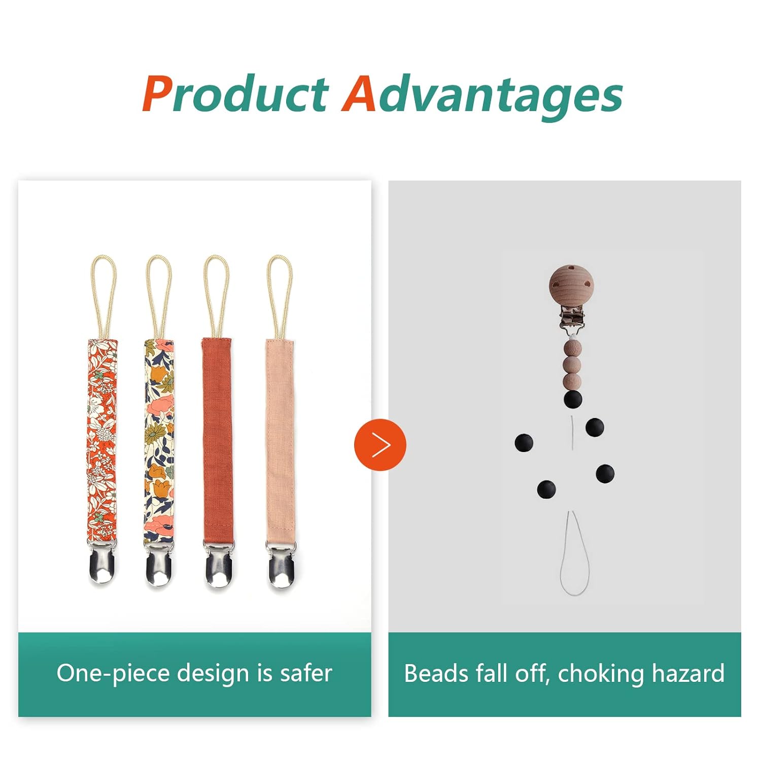 Safe length: We have studied the length of the pacifier clip is very important to the safety of babies, after understanding most of the products on the market, we finally choose 9.55 inches, this length, it is not too short or too long caused by the inconvenience and the danger of tangled neck.