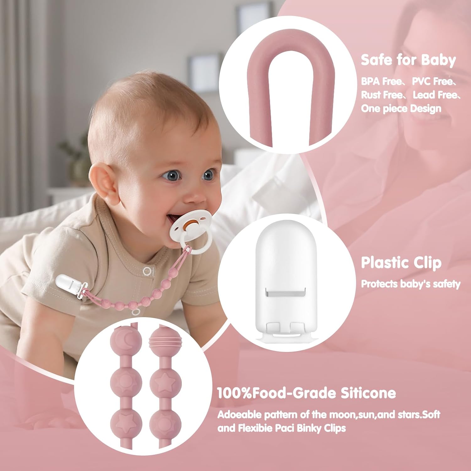 [Easy to Use and Clean] The silicone pacifier clip can be clipped to the baby’s clothes, drool bibs, blankets, and is not easily dropped on the ground. The silicone pacifier clip can be hand-washed or rinsed with warm water. Its design allows for easy cleaning and disinfection, ensuring the health of our children.