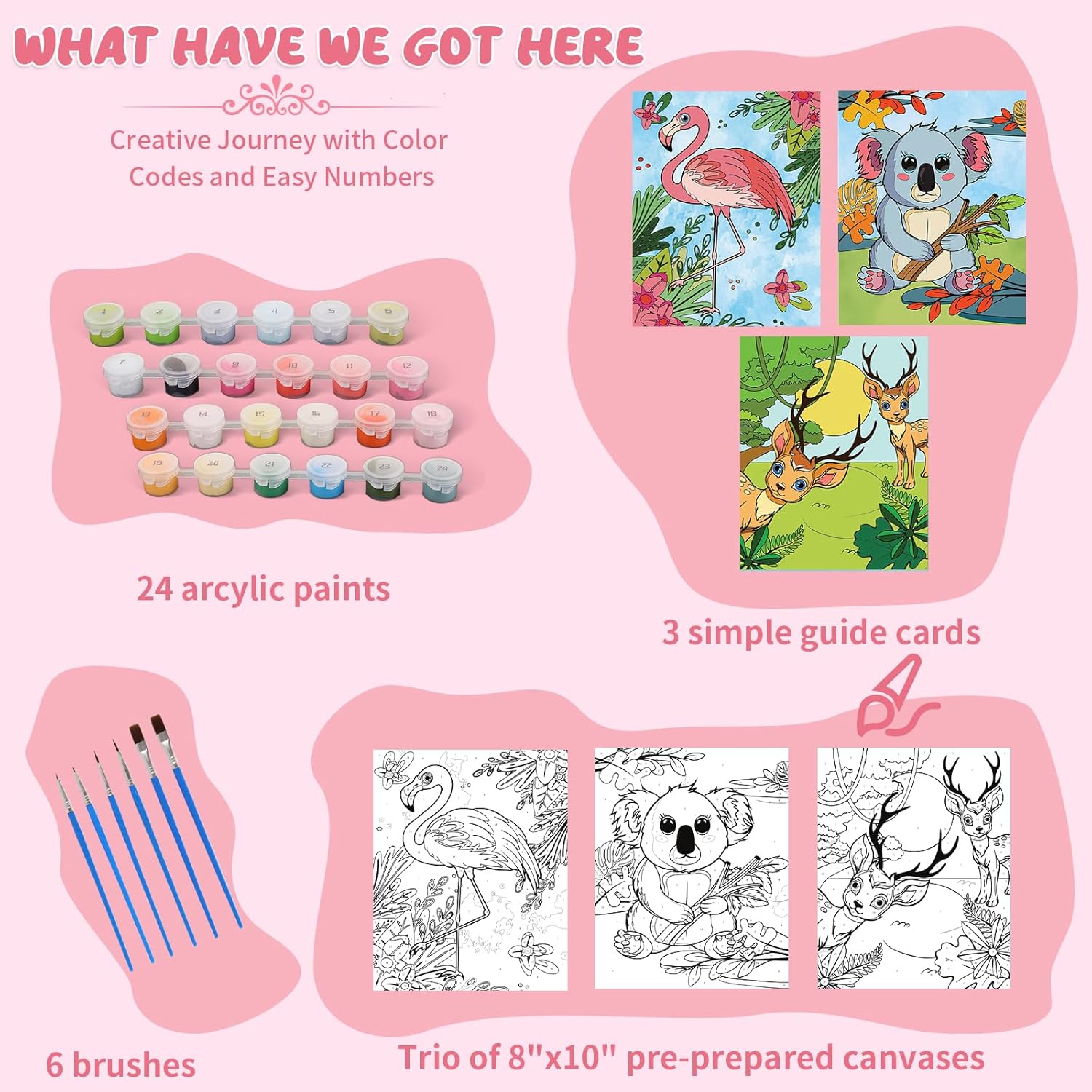Paint By Numbers Kit For Kid and Adult, 3 Pack Pre Drawn Canvas, Includes 8×10 Inch Framed Canvas with 24 Acrylic Paint Pot, 6 Brushes For Kids, Crafts Gift For Girls 6-12, Art Supplies, Paint Set