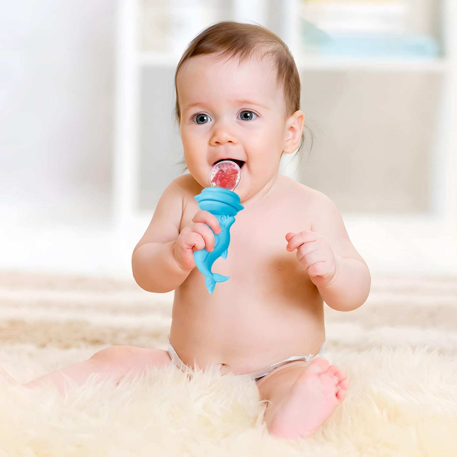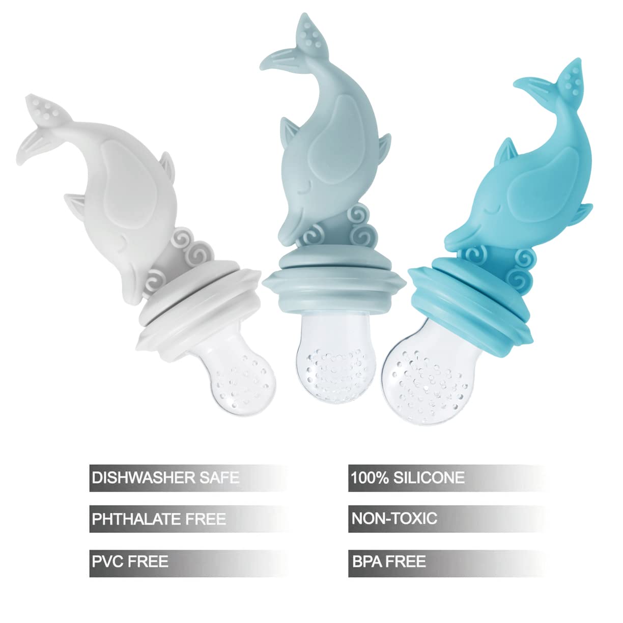 PandaEar 3 Pack Silicone Baby Food Fruit Pacifier Feeder| Silicone Feeder Fruit Holder Sucker for Baby Infant with 3 Different Size Silicone Pouch| Teething Feeder, Dolphin