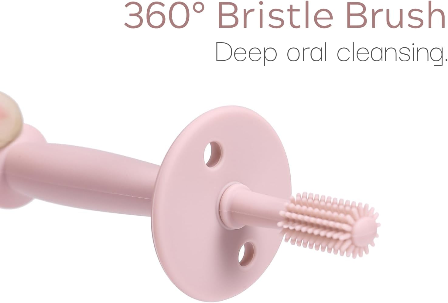【100% MULTI-FUNCTIONAL】For babies 0 months and up, the baby first toothbrush cleans top and bottom teeth and gums simultaneously while providing a gentle gum massage to alleviate teething pain. Our teething toothbrush combine the functionality of a pacifier and teething. Textured surfaces that massage and stimulate gums are perfect for assisting the eruption of front, middle, and back teeth.