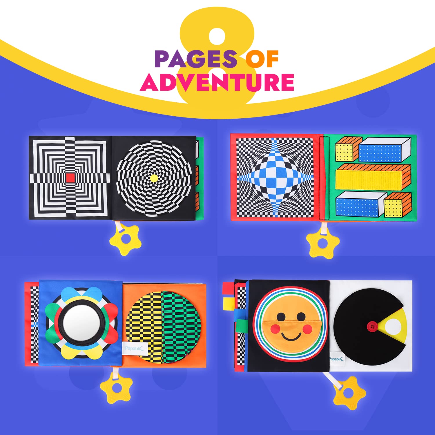 You can always Trust Papablic: we tested this baby soft book with thousands of babies! Baby born with blurred vision, so we chose the patterns that babies are most interested in during experimental plays. Our high contrast baby book helps newborns stimulate development in the retina and the optic nerve, while the teether, crinkle pages and squeaker keep baby exploring and promoting sensory development.
