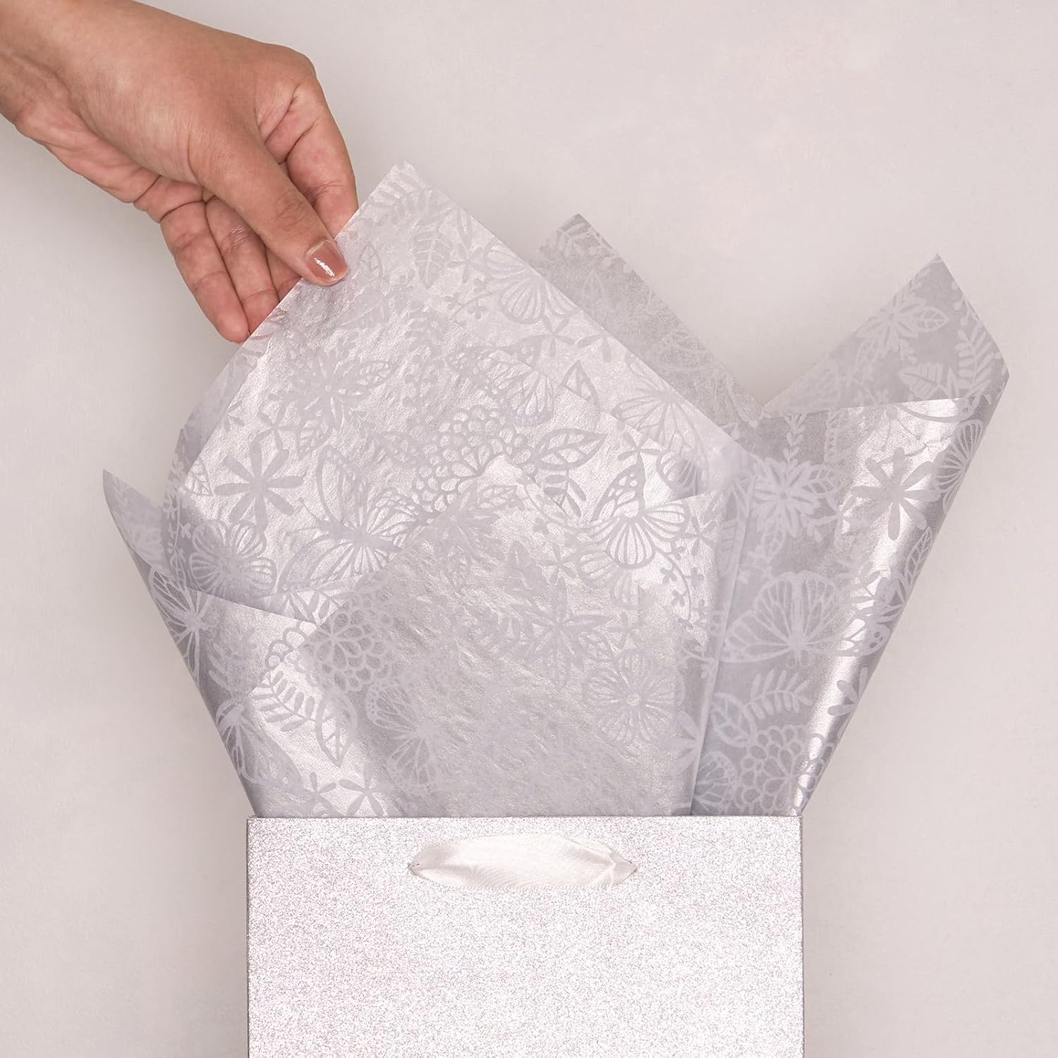 Elegant Metallic Silver with Butterfly Design:Add a touch of elegance to your gift wrapping with PAPER FAIR’s 60-sheet pack of metallic silver tissue paper featuring a delicate butterfly pattern. This sophisticated design is perfect for any special occasion.