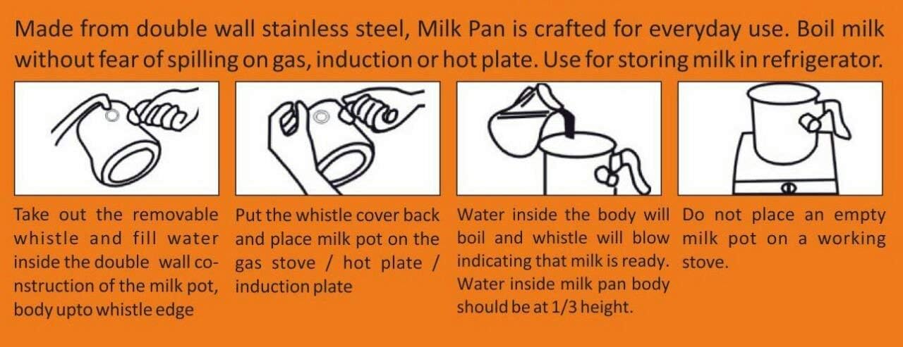 Strong & Sturdy Cool-touch handle, Rust Proof & Hygenic Easy to Wash & Clean, Healthy Serving For Family High Quality Stainless Steel, Heat Resistant Bakelite knob Induction Compatible NOTE : DO NOT DRY HEAT! Before use please unscrew the whistle on the side of the pot and fill it with approximately 1.5-3 glasses of water as per the size of MILK BOILER you use.