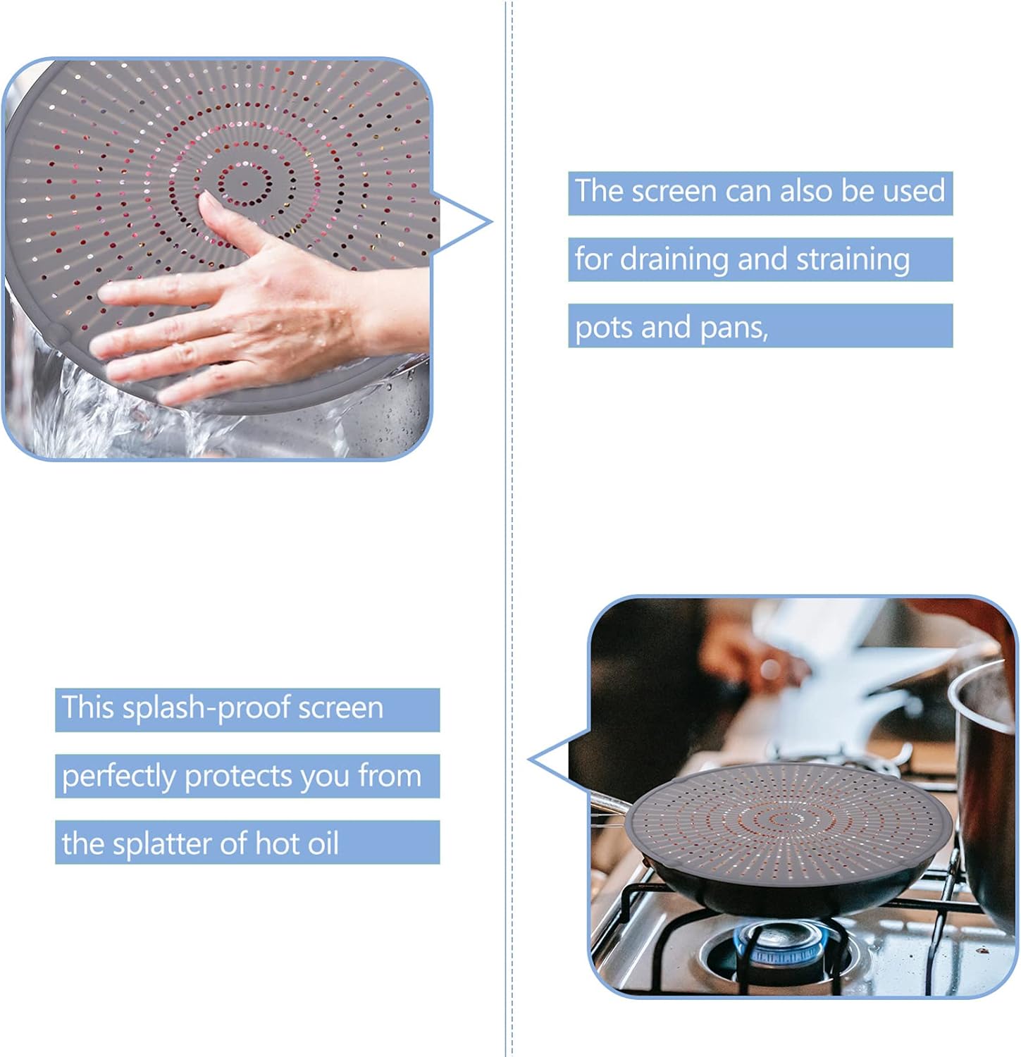 This net pot lid is made of environmentally friendly and healthy materials, durable and safe to use. and does not easily leave stains on the surface of the lid. The handle is long, comfortable and convenient to take and use. used to block the oil and the hot oil from scalding your skin.