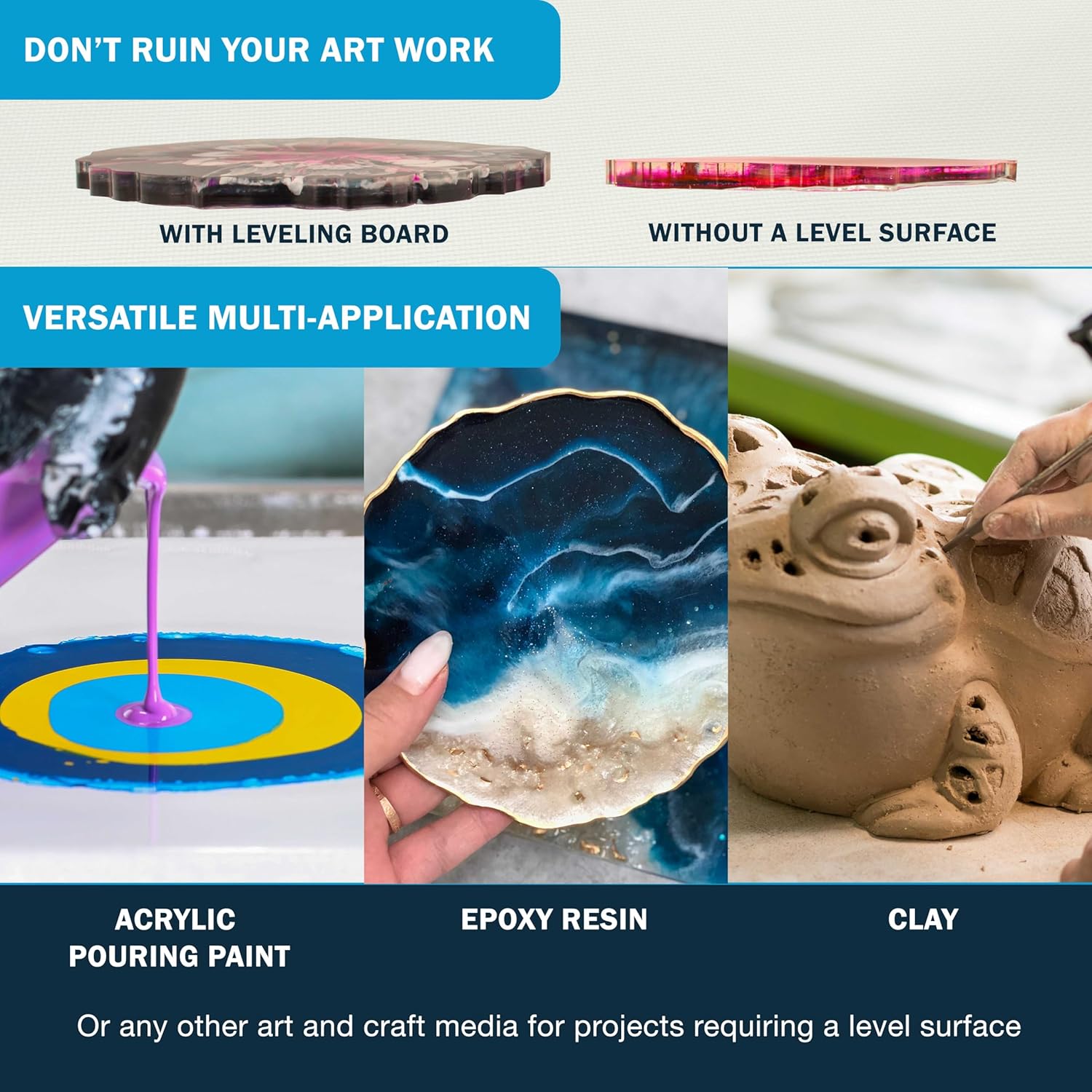 16″ x 12″ Pouring Masters Resin Leveling Board with 3 Silicone Cover Mats. A versatile multi-application leveling board that is essential to use when working with epoxy resin and molds, acrylic pouring paint, liquids, clay, or any other art and craft media for projects requiring a level surface.