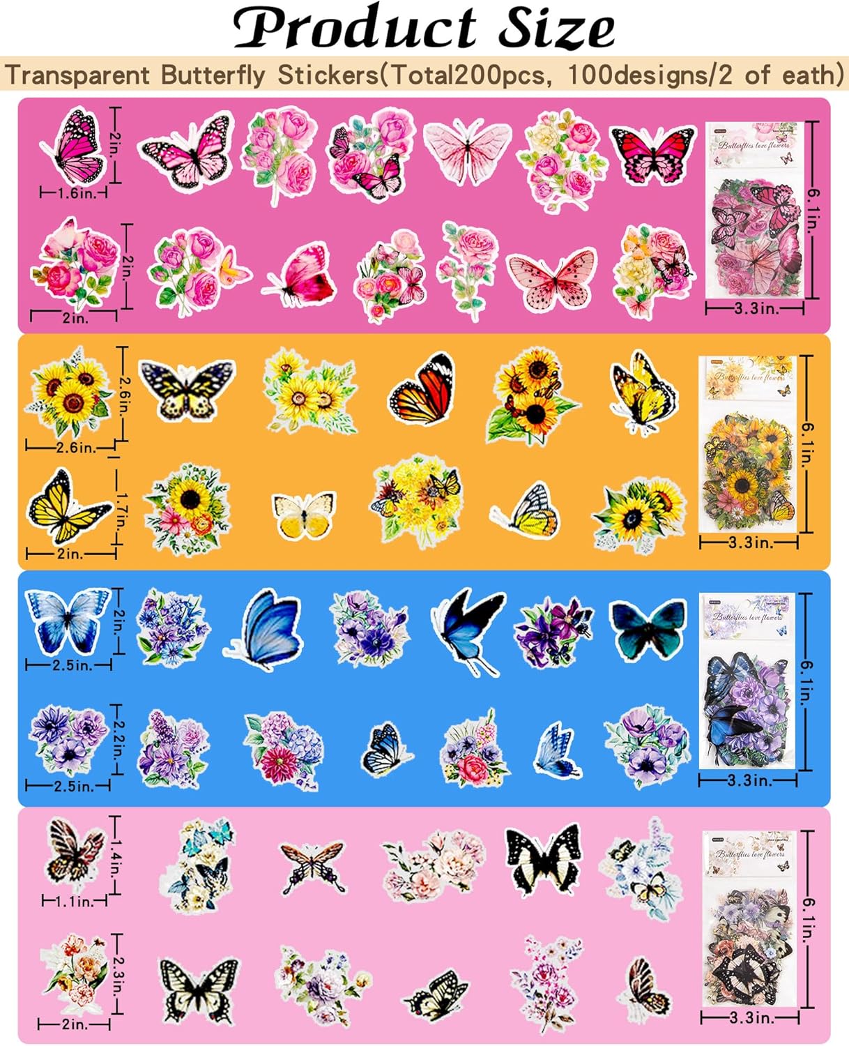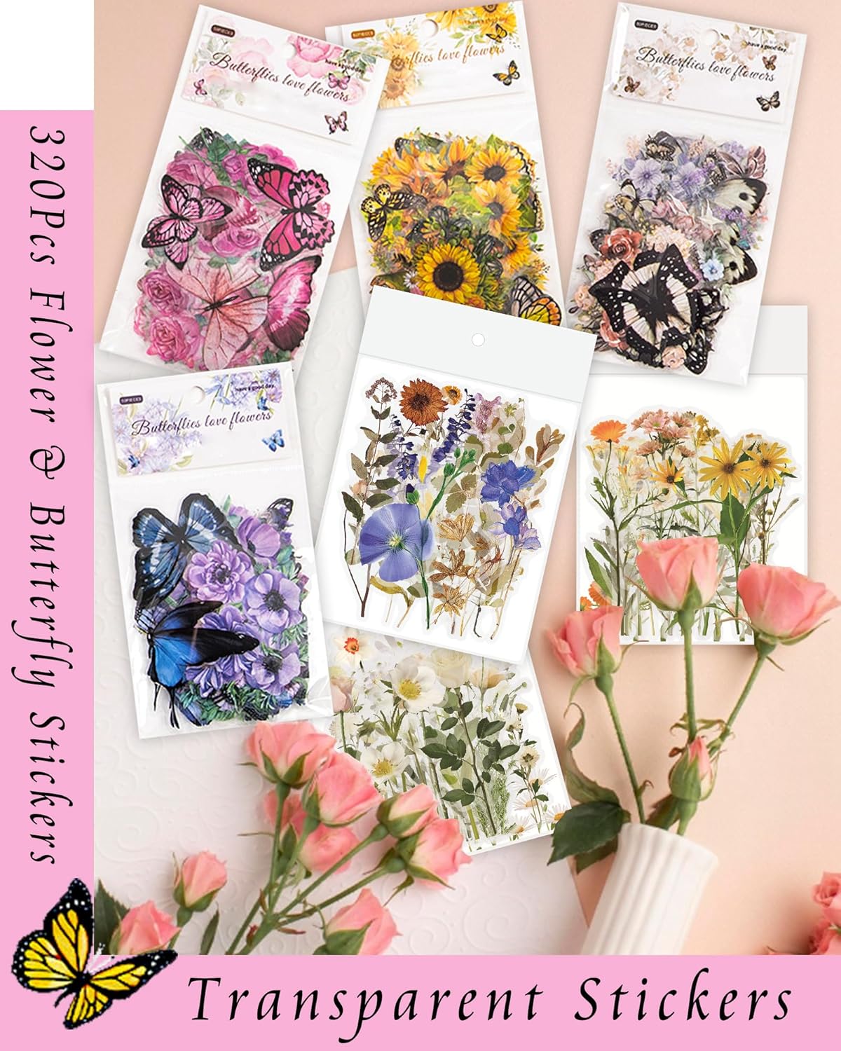 QKisily 320PCS Transparent Flower Butterfly Stickers for Scrapbooking, Floral Stickers for Adults Art Crafts Butterfly Stickers for Girls Scrapbook Journaling Supplies