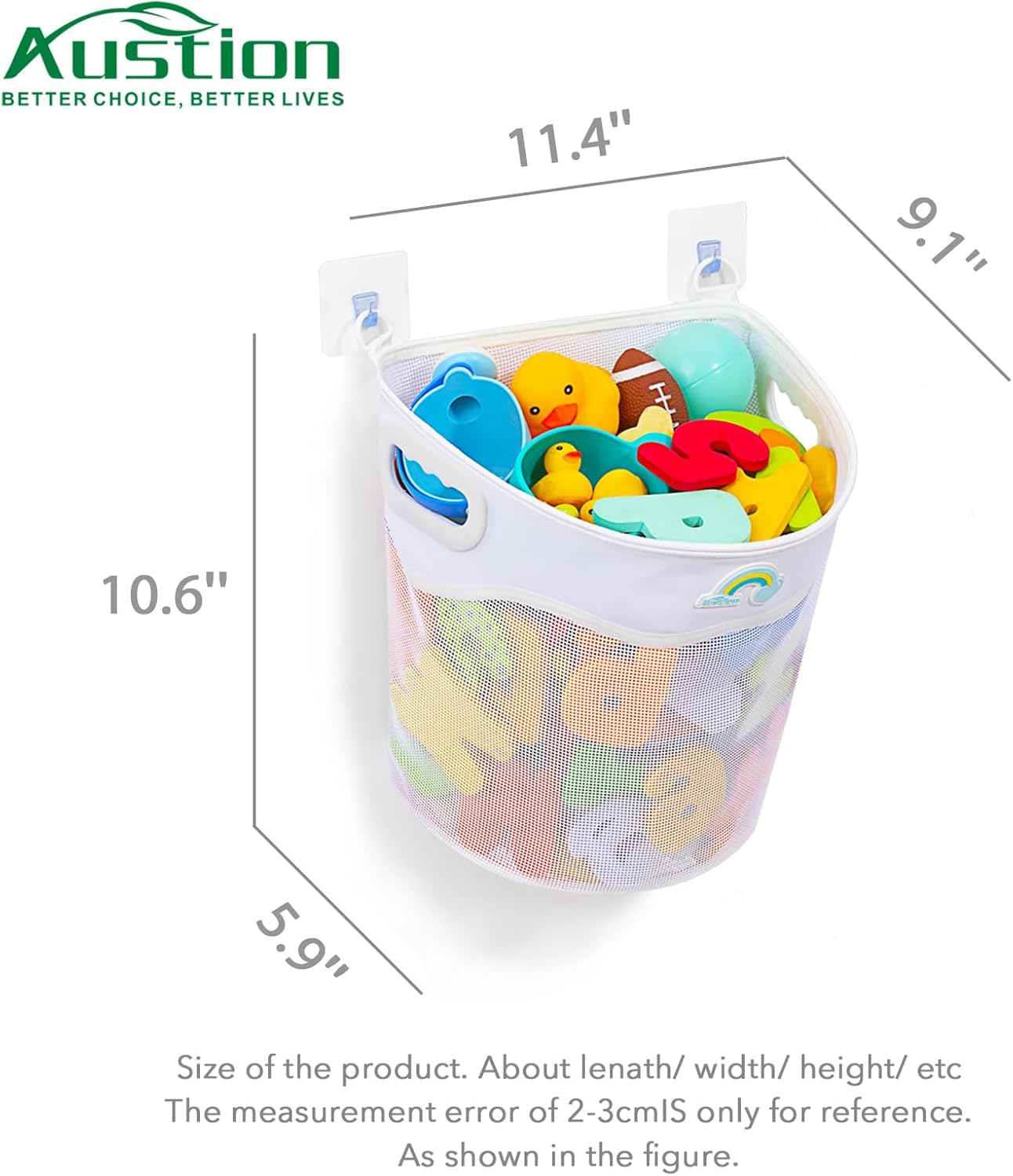 Wall Mounted Bath Toy Organizer: Austion bathtub toy holder uses adhesive wall stickers to keep the hanging stable,After months of load-bearing tests, it is more stable and durable than suction cups. You don’t have to worry about falling and rusting; An extra set of replaceable strong adhesive wall stickers is included to ensure that you can change the position of the sticker in the future.