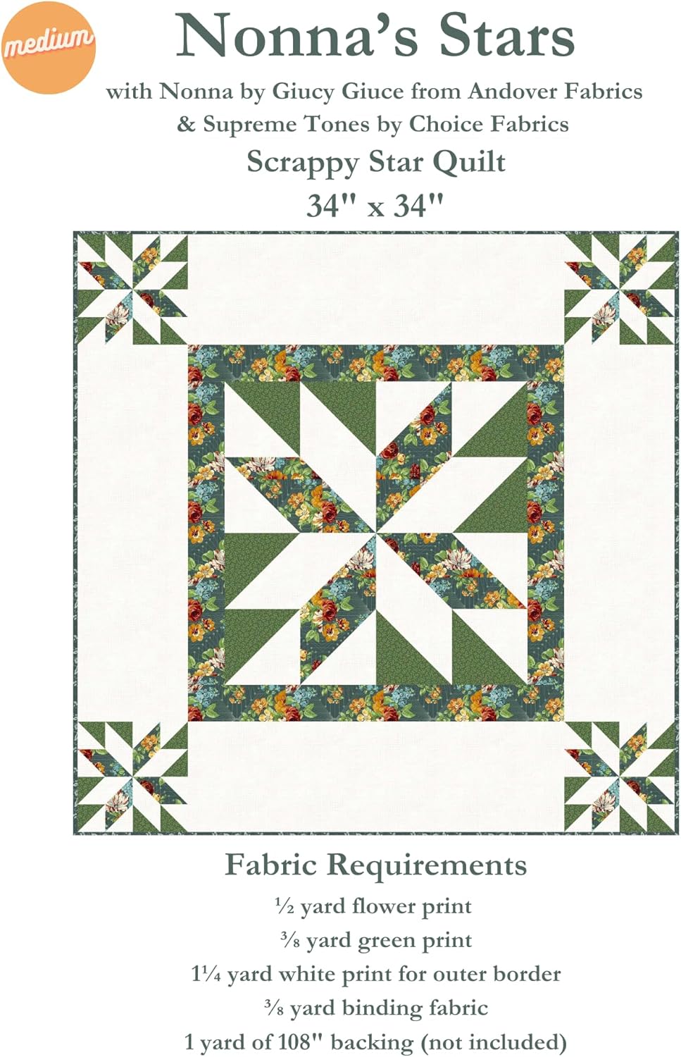 Our Nonna’s Stars kit, a Scrappy Star quilt made from the Nonna collection by Giucy Giuce from Andover Fabrics & Supreme Tones by Choice Fabrics, is the ultimate solution for both beginners and seasoned quilters. Our kit includes 1¼ yards of the Nonna collection, along with 1¼ yards of Supreme Tones ready to be cut, allowing you to effortlessly create a stunning 34″ x 34″ quilt top. Step-by-step instructions are thoughtfully included in your kit. You’ll find that completing this kit is a breeze with just a few simple cuts, guaranteeing a stress-free and delightful quilting journey. For the finishing touch, separately order 1 yards of 108″ backing fabric. We recommend using Choice Fabrics 108″ Supreme Backings 🙂 Quilt Size: Lap (34″x34″) Difficulty: Medium