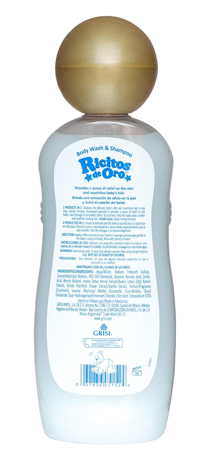 Ricitos de Oro Baby Shampoo and Body Wash, Formula with Oats and Vanilla, Hypoallergenic, Tear-Free Body Wash and Shampoo, 2-Pack of 13.5 Fl Oz Each, 2 Bottles