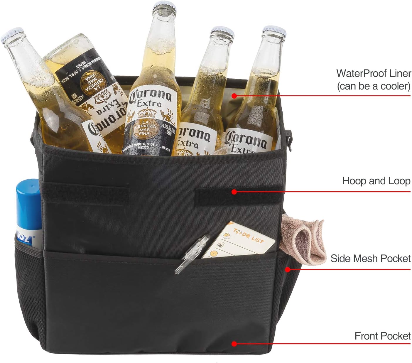 Durable Waterproof Lining – The interior of the car trash bin is a durable leak proof liner to keep liquid from getting dirty. It also can be a travel cooler that holds ice to keep drinks cool for hours. Build-in cardboard on both front and back side for structure support which makes the bag stand by itself.