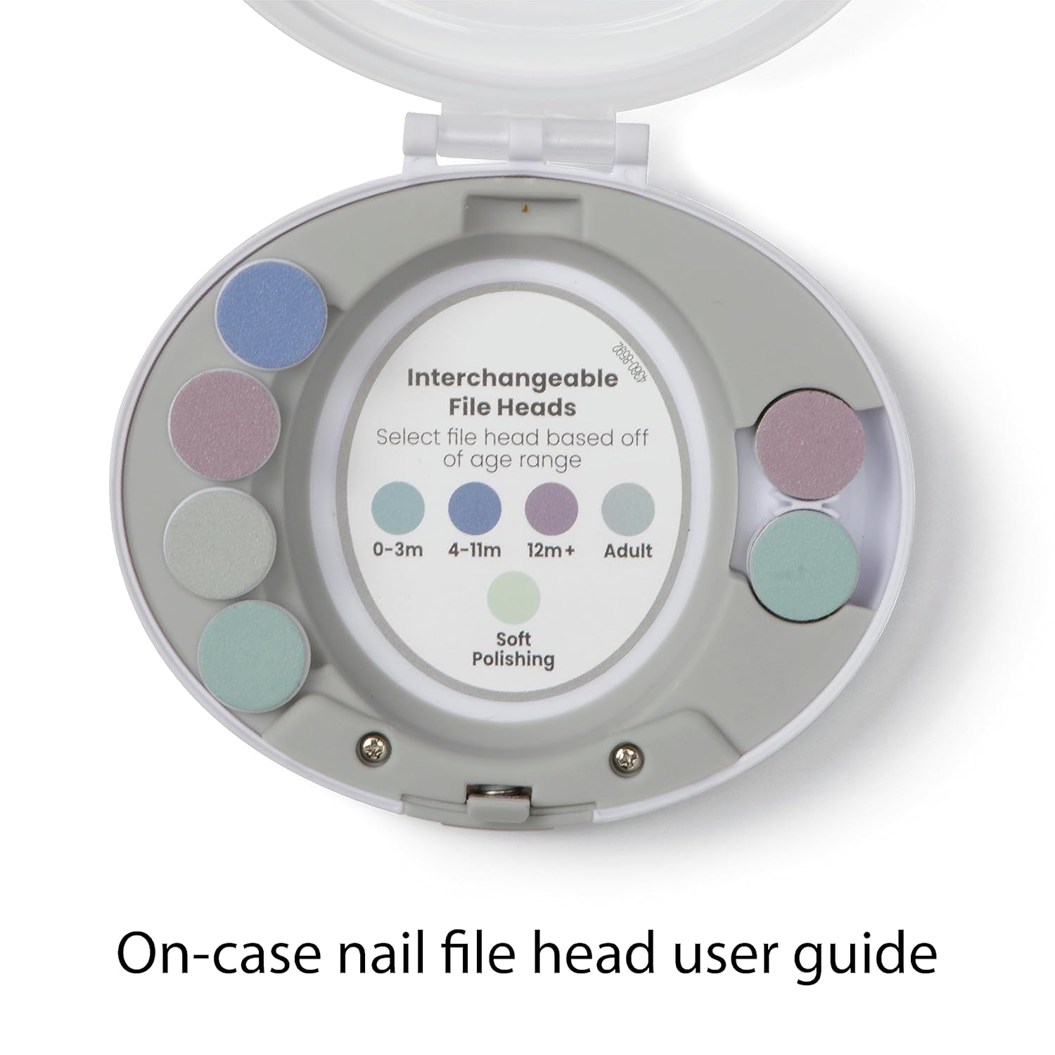 NAIL CARE FOR THE WHOLE FAMILY This file can be used on newborns and is suitable for adults. 5 age-graded file heads accommodate the nail needs of the whole family (3 for kids, 1 for adults, 1 buffer).