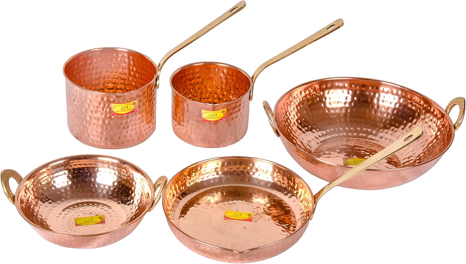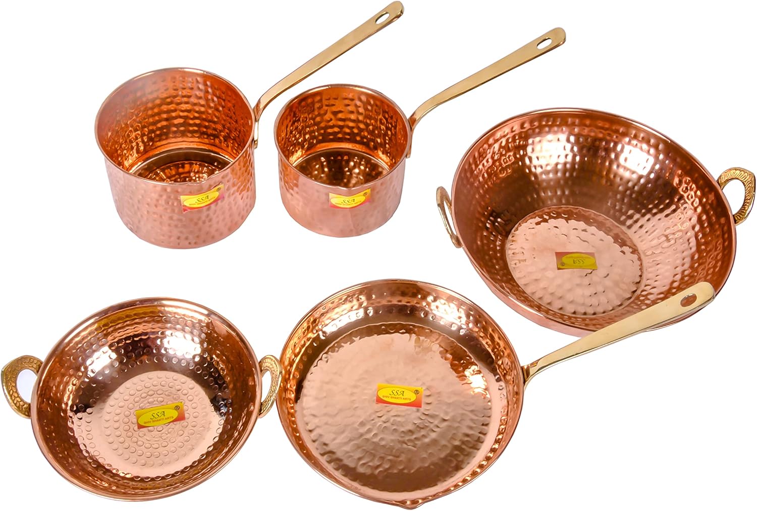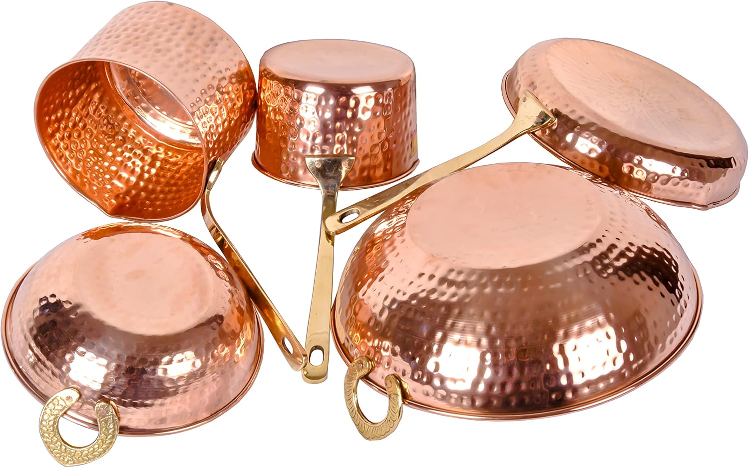 Shiv Shakti Arts® Pure Copper Cookware Set 5 Piece Set (Copper Sauce Pan Set | Copper Kadhai Set | Copper Fry Pan) with Brass Handle for Cooking Purpose