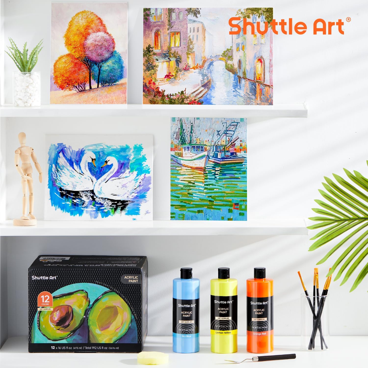 12 COLORS BULK PAINT: Shuttle Art 12 colors acrylic paint set contains 12 commonly used colors acrylic paints in bottles, and each contains 473ml/16oz large volume paint, ideal for artists, beginners, kids and adults on painting and crafting.