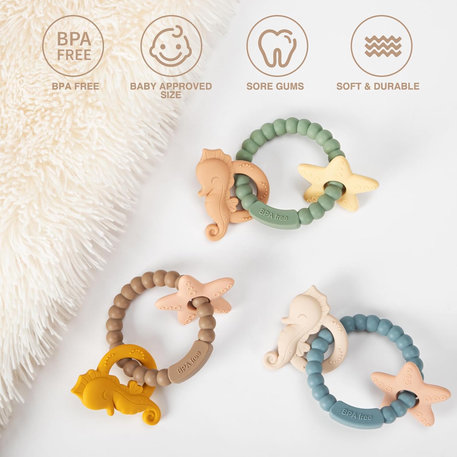 【Cute Sensory Baby Toy】TOHIBEE baby teether toys are inspired by the ocean and designed with baby’s favorite elements–Cute seahorse and starfish, add a lot more fun to your little one chewing exploration! The skin friendly materials and neutral color, which help alleviate baby’s anxiety.