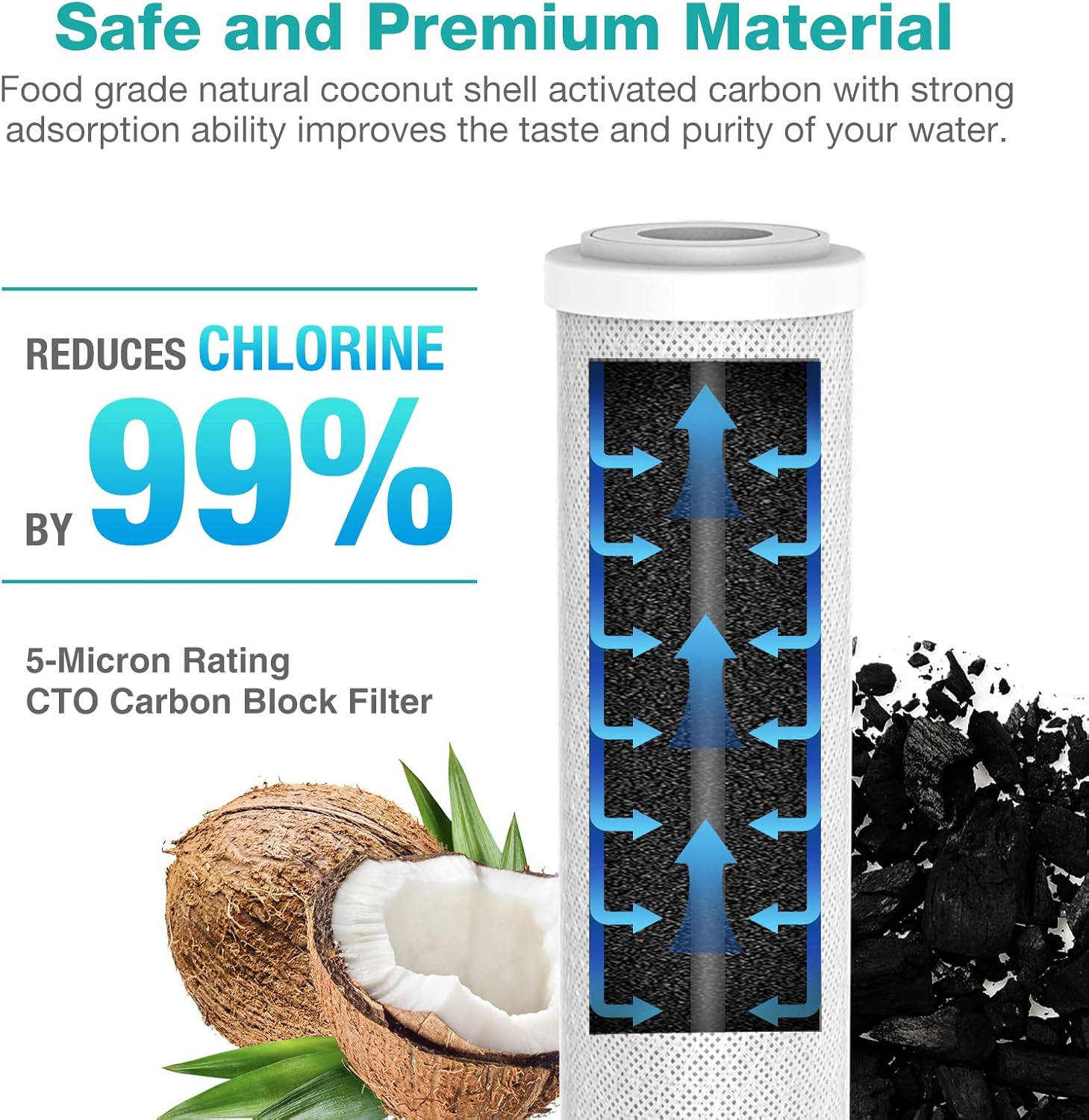 💧 [𝐒𝐀𝐅𝐄&𝐑𝐄𝐋𝐈𝐀𝐁𝐋𝐄] This 5 micron whole house water filter replacement is NSF certified, manufactured with high purity coconut shell activated carbon and wrapped with dense PP food-grade non-shedding fabric, preventing carbon fines from entering the filtered water. Odorless, no leaking or secondary pollution, so that providing you a healthy and enjoyable safe water-filtering experience.