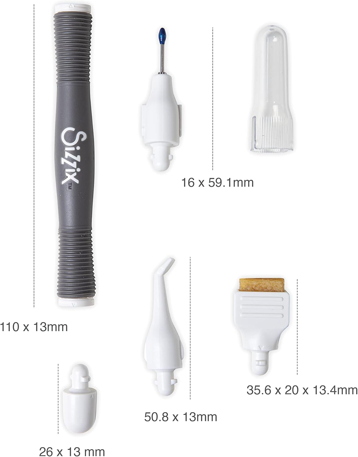 APPROXIMATE SIZES – 1x Pick Up Tool (with 1x lid) – 16 x 59.1mm 1x Push Tool – 50.8 x 13mm 1x Adhesive Eraser – 35.6 x 20 x 13.4mm 1x Dual Ended Handle – 110 x 13mm 1x End Cap – 26 x 13mm