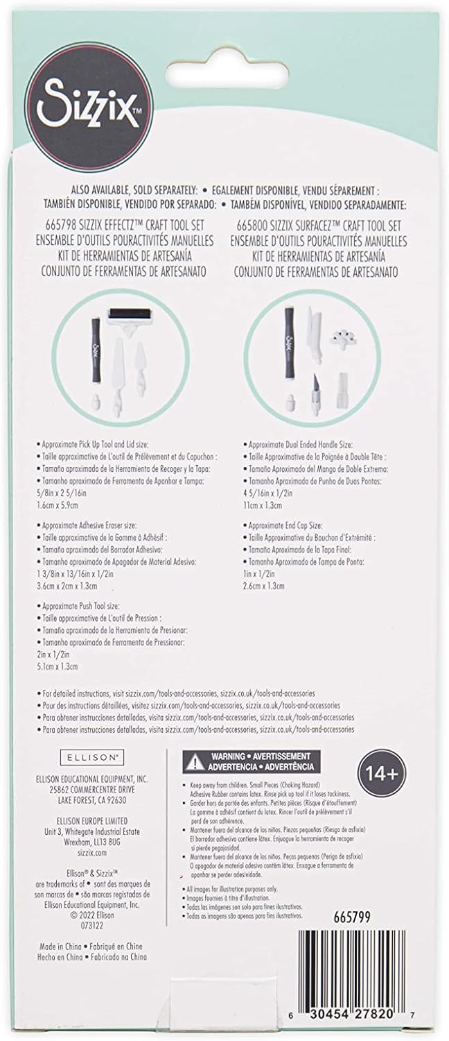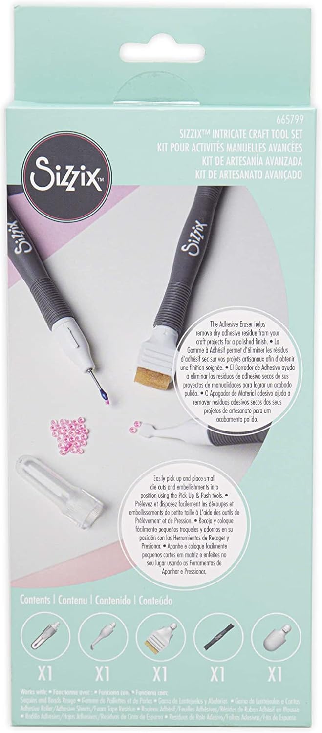 Love using intricate dies and embellishments? The Sizzix Intricate Craft Tool Set is just the product for you! This set is perfect for using with those super small die cut pieces or for adding some extra glitz and glamor to a project. With the Dual-Ended Handle you can use two attachments at one time. Use the Sticky Tool attachment to pick up small items like Sequins and beads, the Push Tool allows you to make sure they fit snugly into place, and the Adhesive Eraser will help you remove any excess Adhesive from your project for a polished end result. This set also includes an end cap to add when only one tool is used at a time.