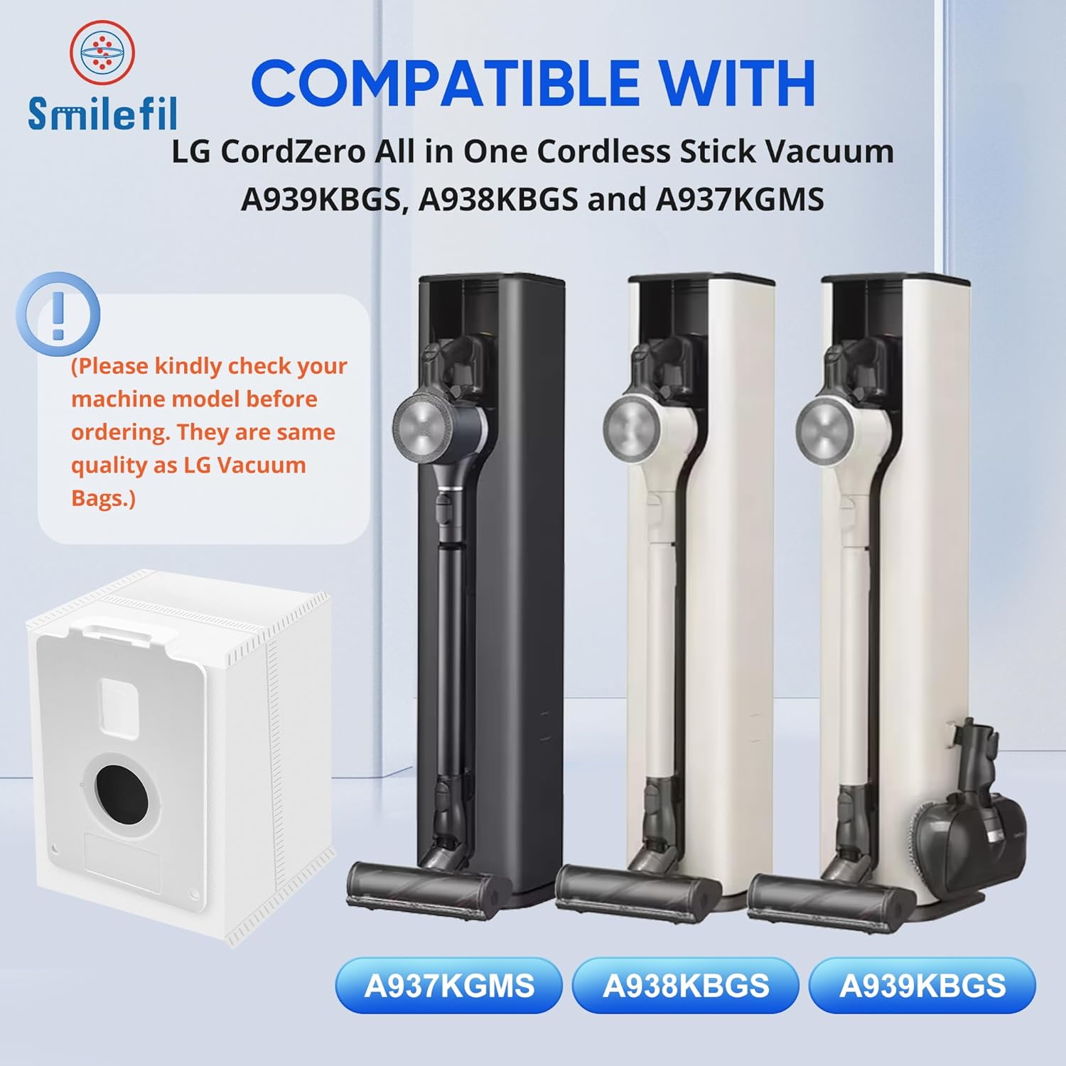 The cordzero vacuum bags only compatible with LG CordZero All in One Cordless Stick Vacuum A939KBGS, A938KBGS and A937KGMS. Please kindly check your machine model before ordering. They are same quality as LG Vacuum Bags.
